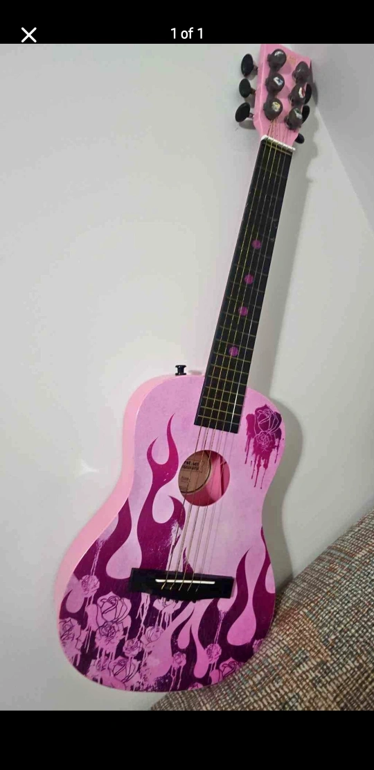 Selling a fun pink First Act acoustic guitar! It's got a cool design with flames and roses. Perfect for a beginner who wants to learn how to play! 1 string is missing.