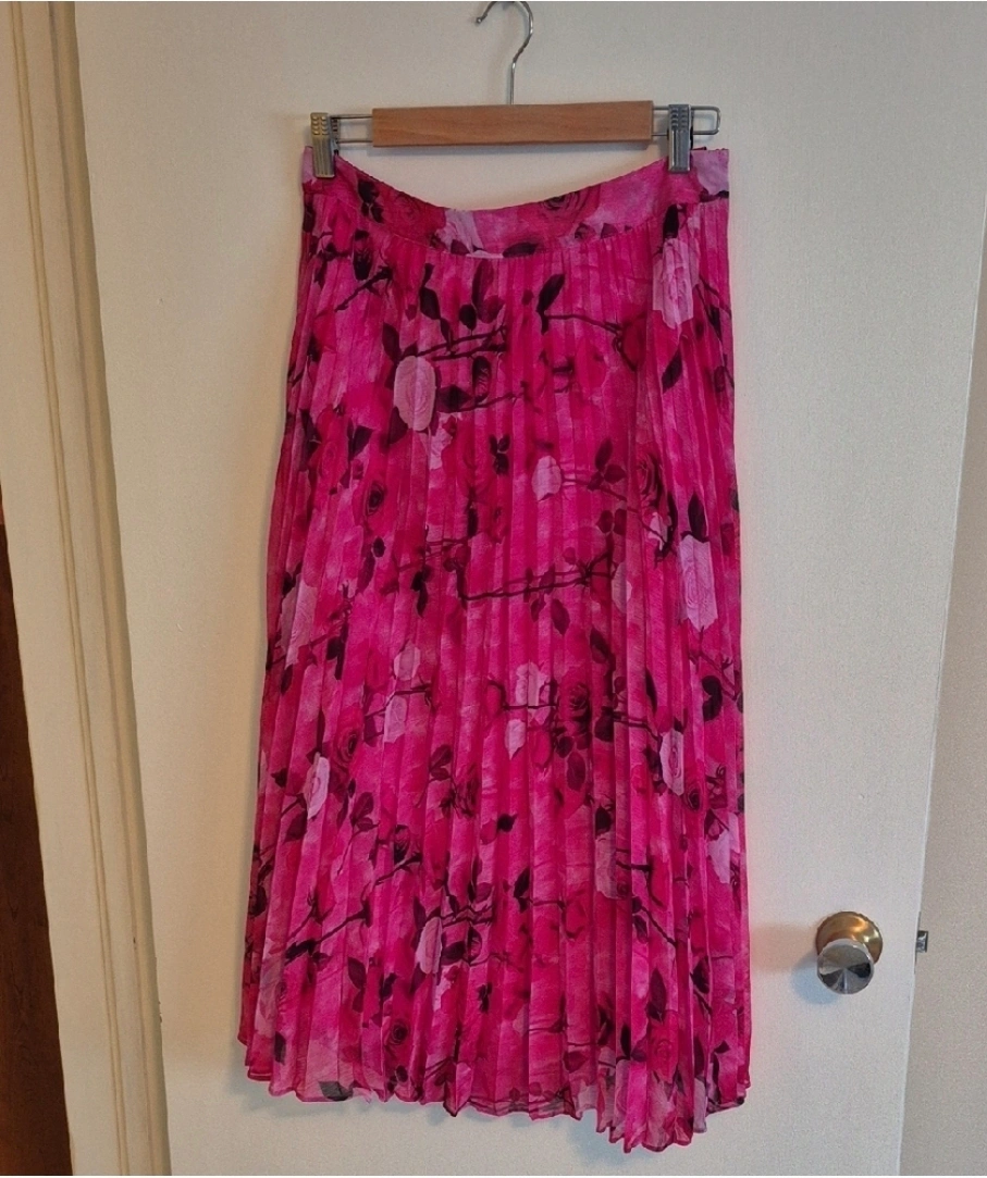 Here's a lovely pink skirt with a floral pattern! It has a pleated design, perfect for adding a touch of elegance to your wardrobe