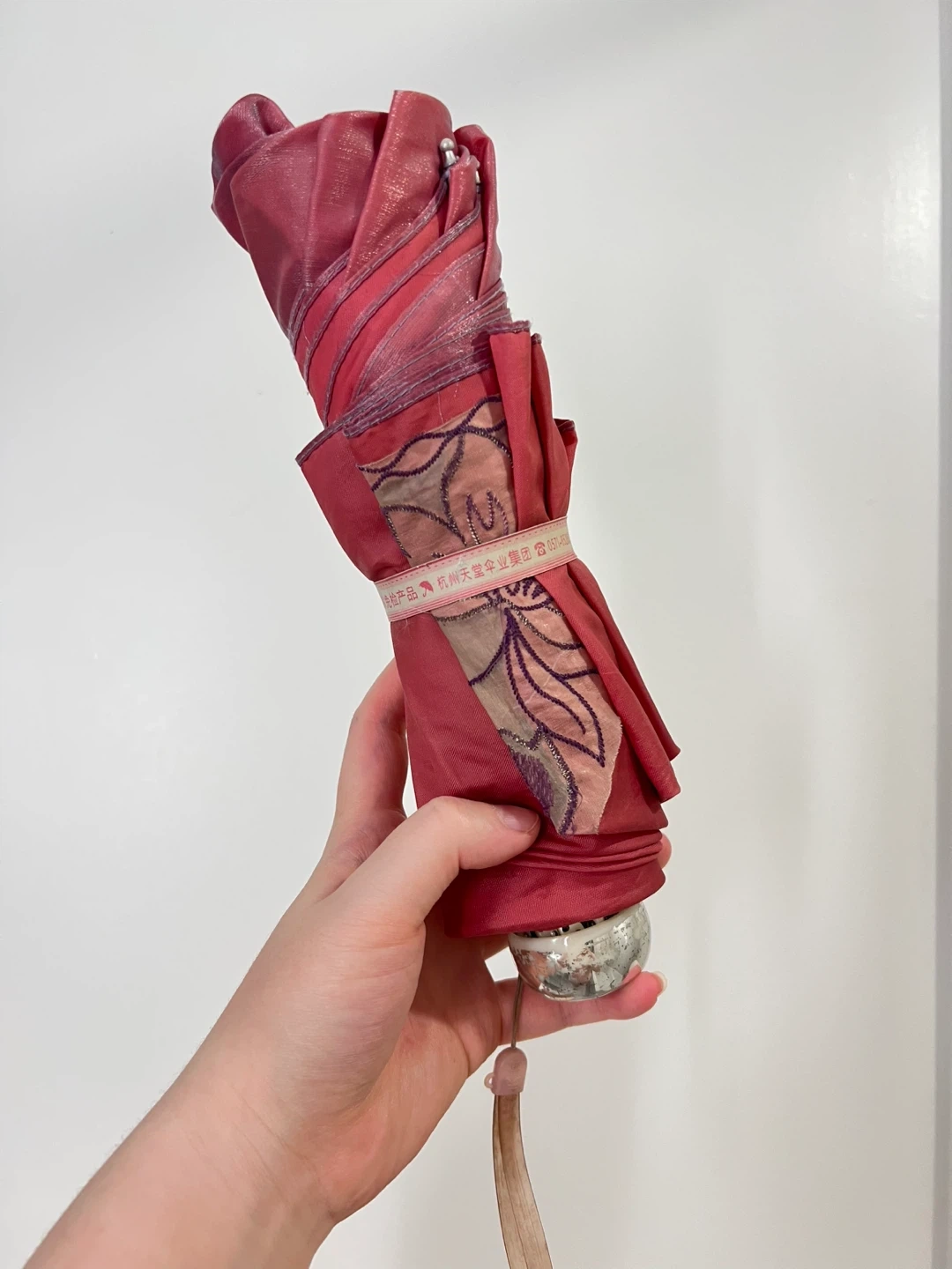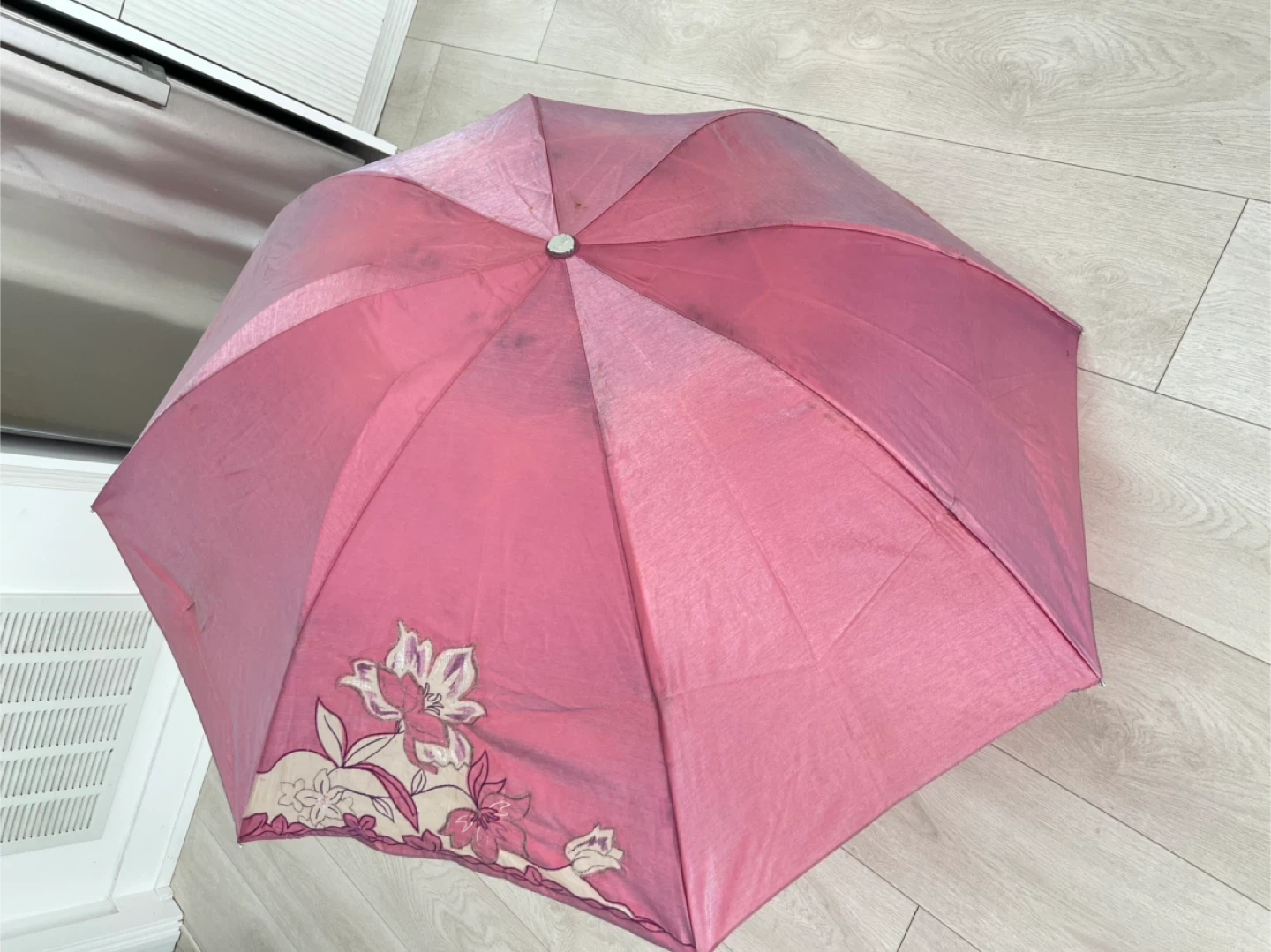 Selling a used pink umbrella with a floral design! It's in good condition and perfect for rainy days and sunny days for UV protection. There are some signs of use, but it's still fully functional and ready to keep you dry