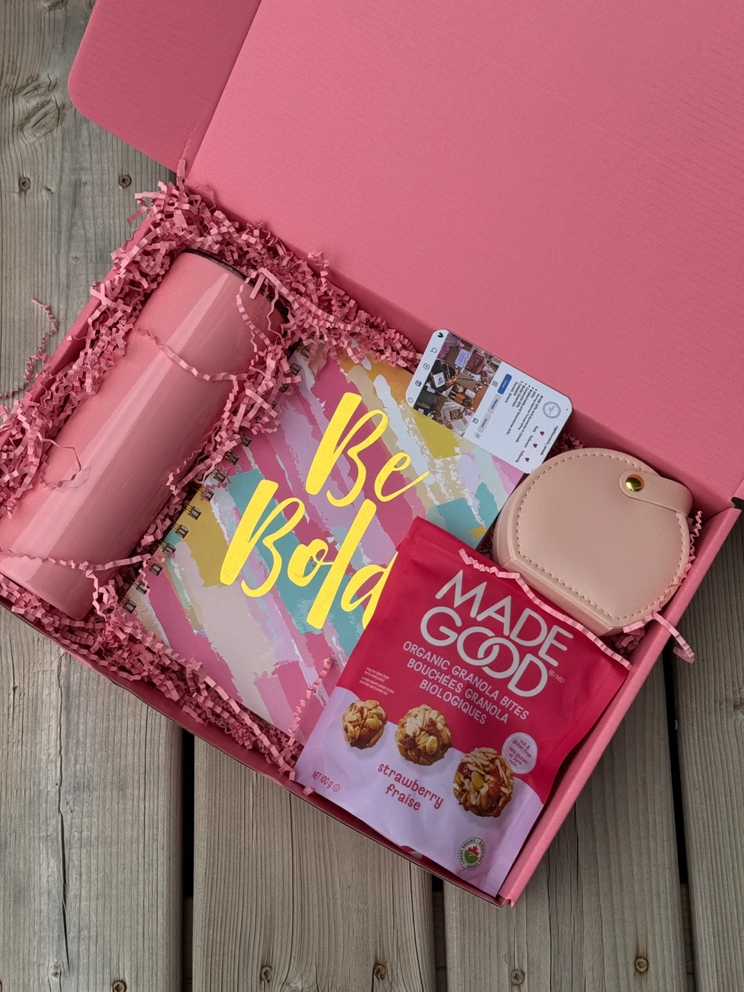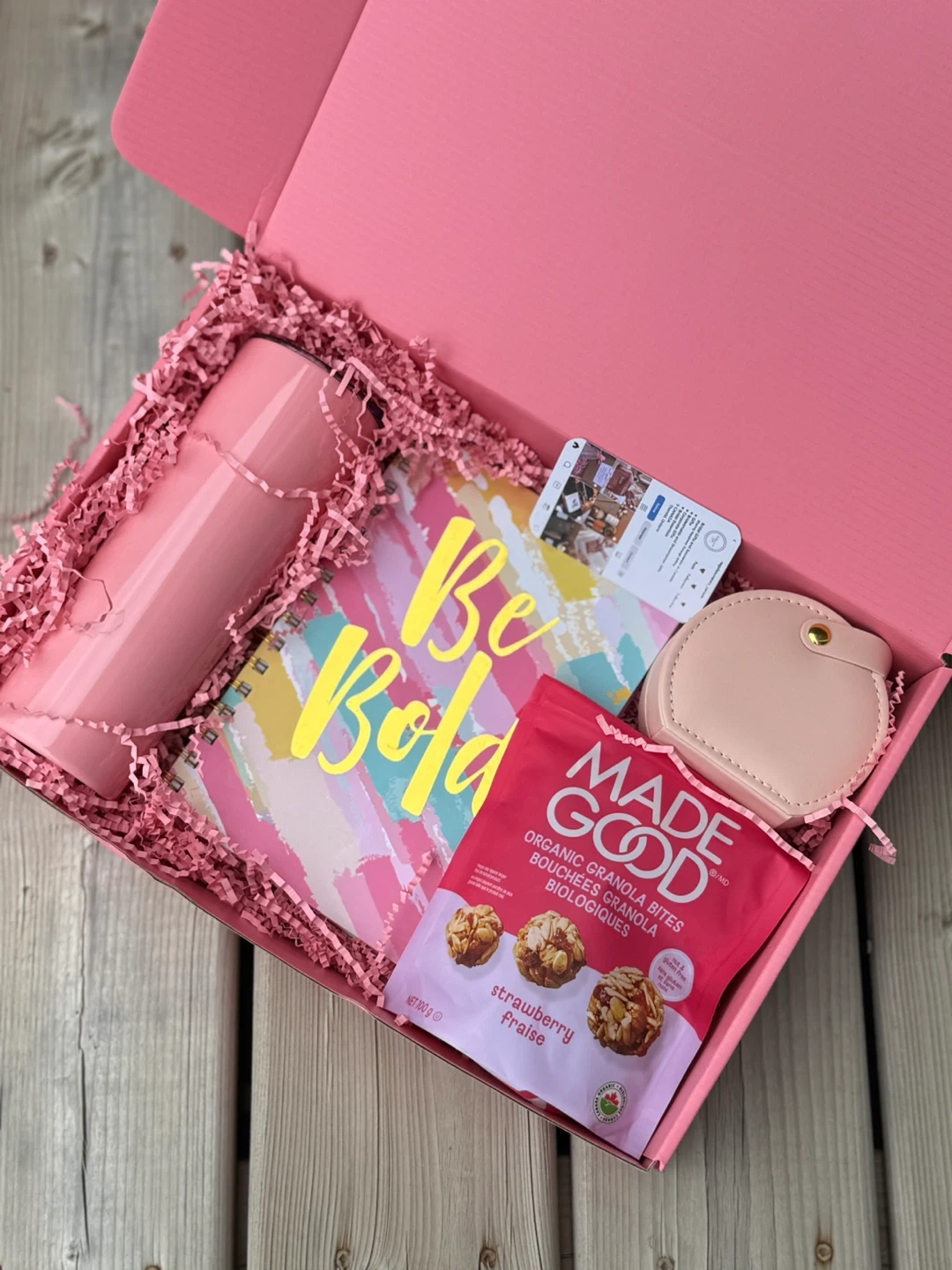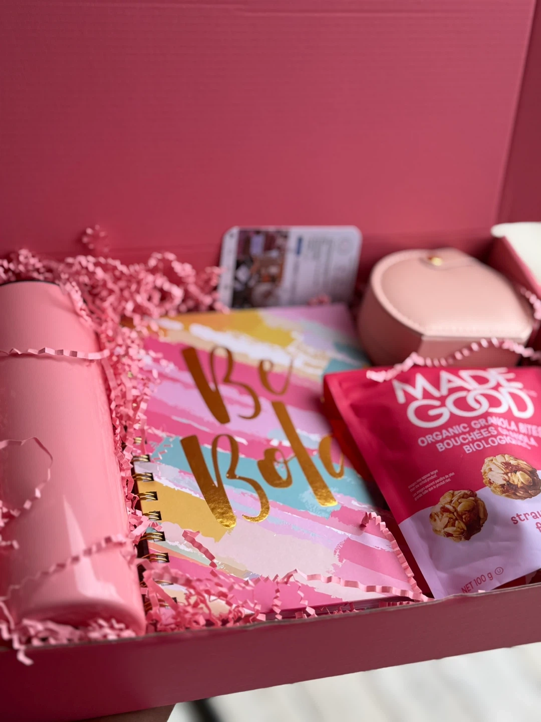 Selling a cute pink gift box! It includes a tumbler, a notebook with 'Be Bold' written on it, a small coin purse, and a bag of MadeGood Strawberry granola bites. A sweet little treat for someone special!