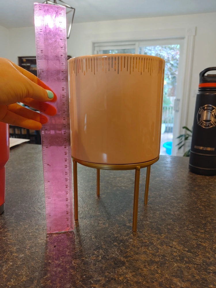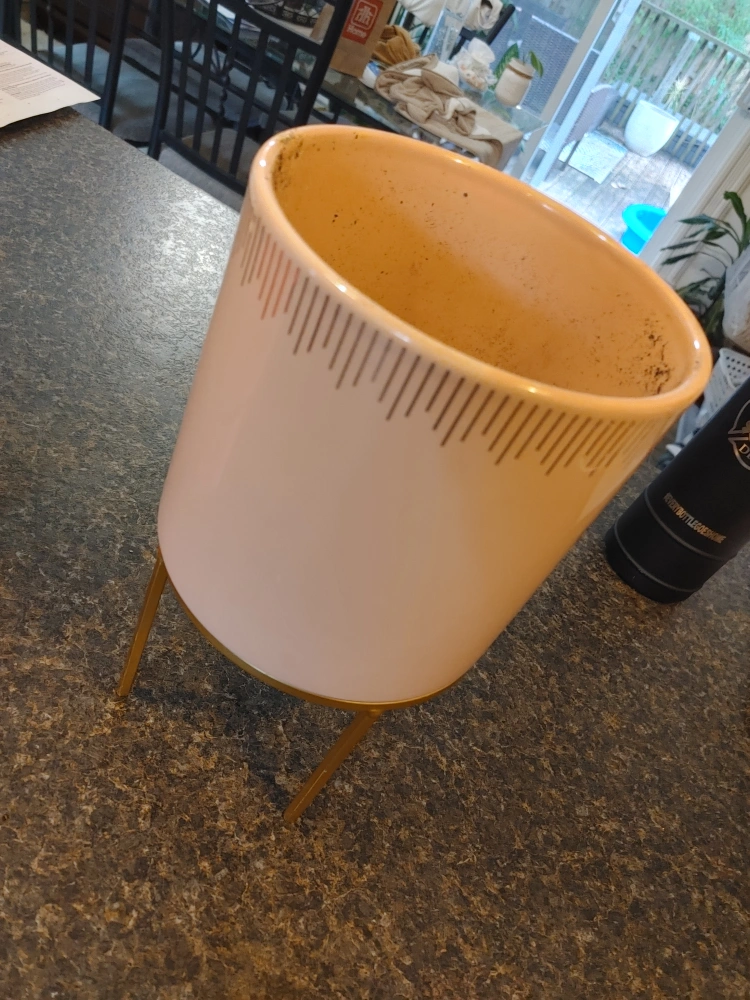 Selling a cute pink plant pot with a gold stand! It's in good condition and ready for a new plant friend. The pot is about 25 cm tall and 14 cm in diameter