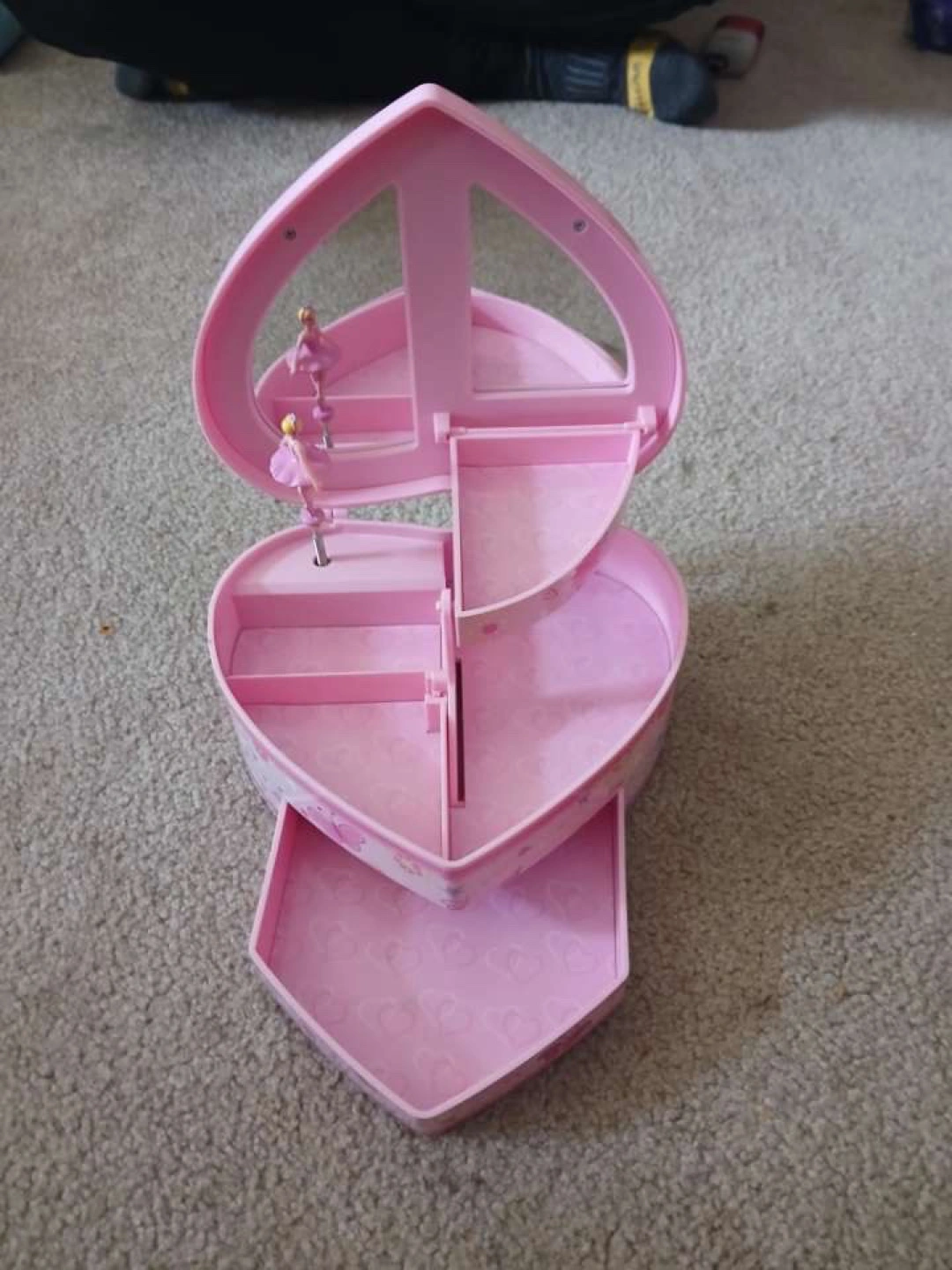 Two-layer jewellery box. Heart-shaped design. Features ballerina figurines. Multiple compartments for storage.