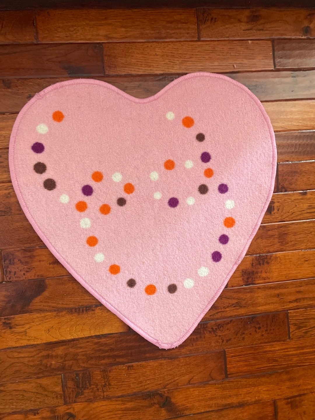 A cute and charming pink heart-shaped rug! It features a playful polka dot pattern with white, orange, brown, and purple dots. Perfect for adding a touch of whimsy to any room!