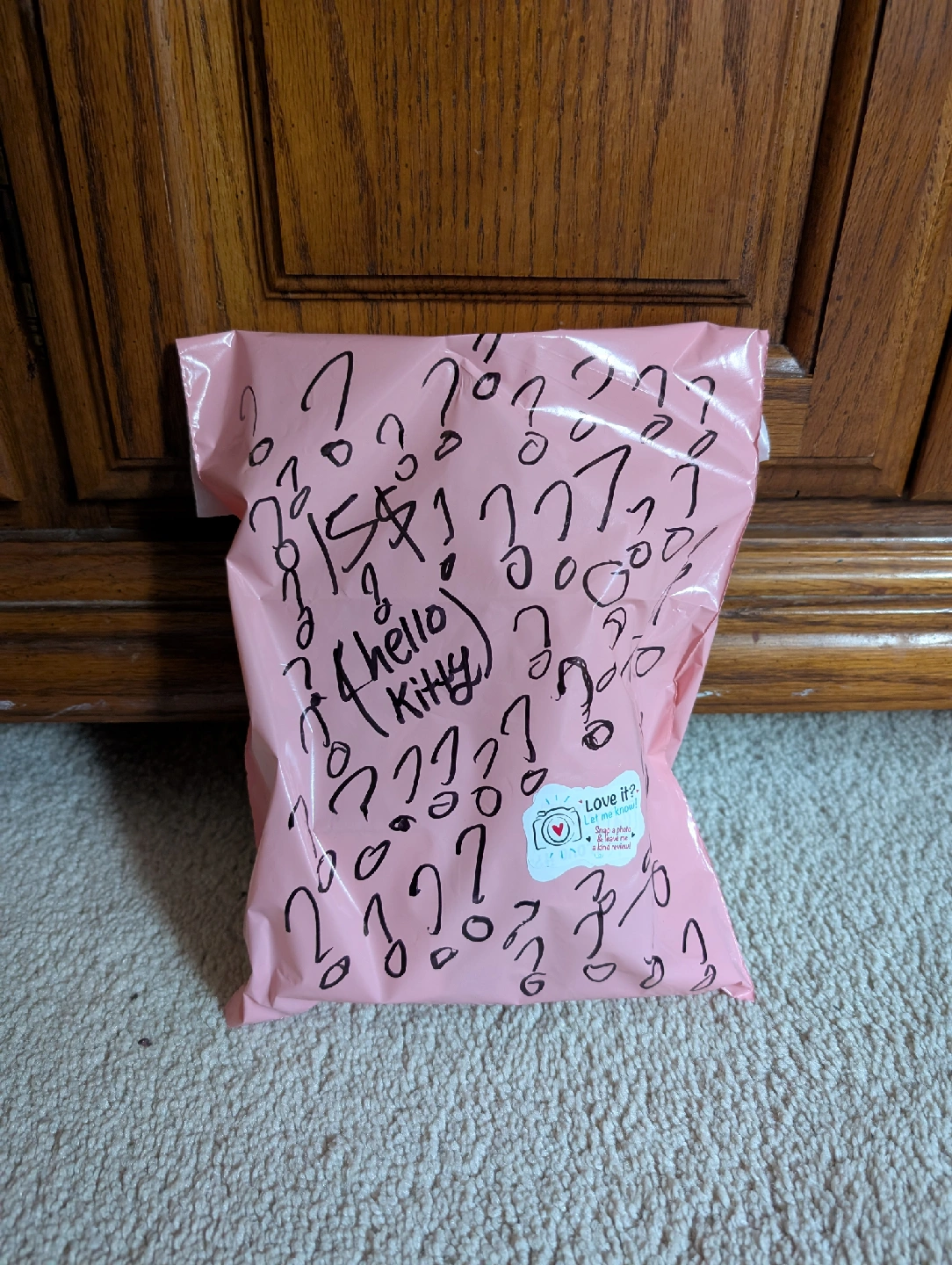 A pink package with Hello Kitty themed designs! It has question marks all over it (mystery package) worth 15$ items worth up to 20$ (maybe more) ๐