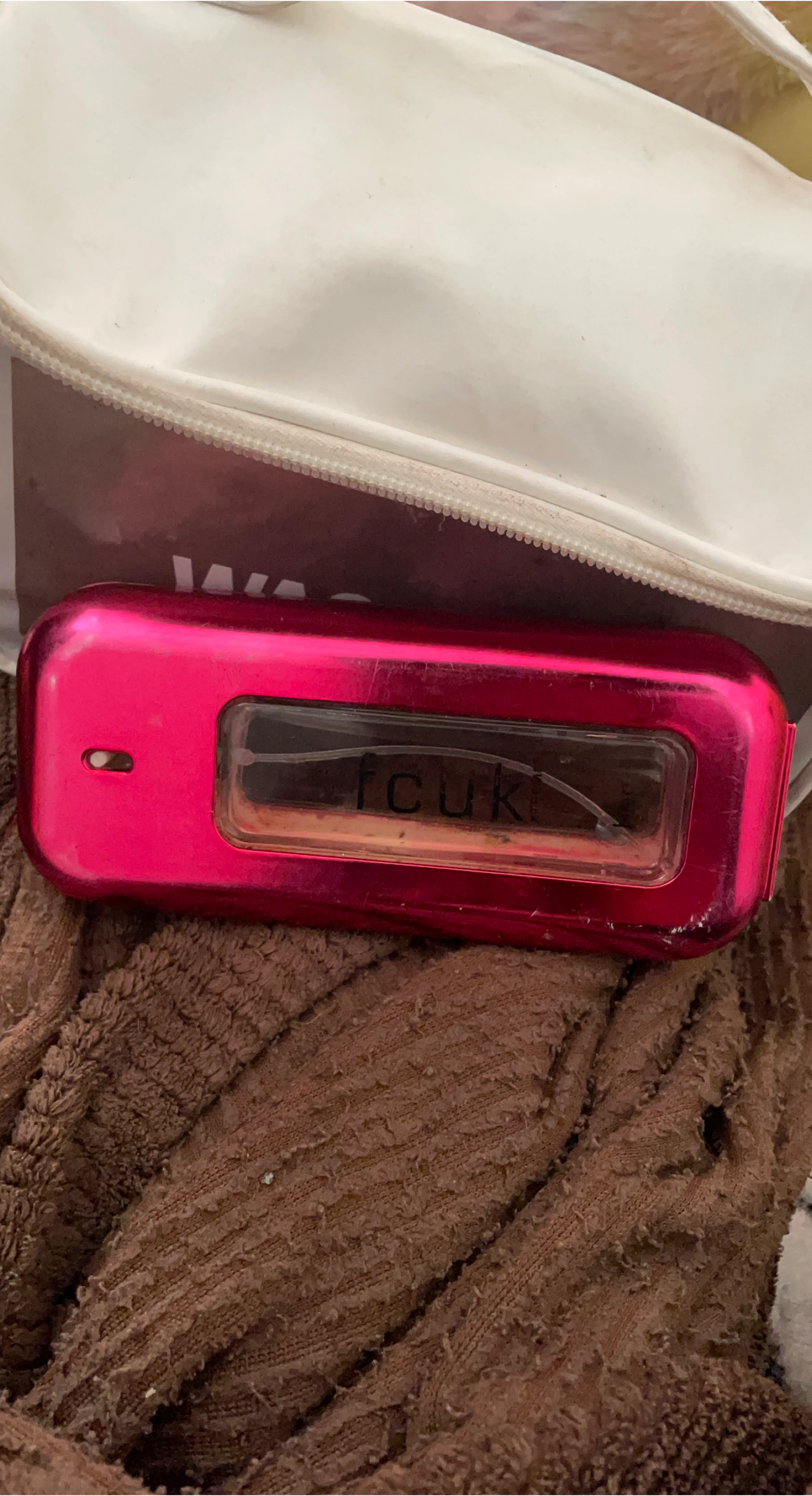 Here's a pink perfume atomizer with 'ICUK' on the front! It has some wear and tear, as you can see in the photos, but still works great. Perfect for carrying your favourite scent on the go