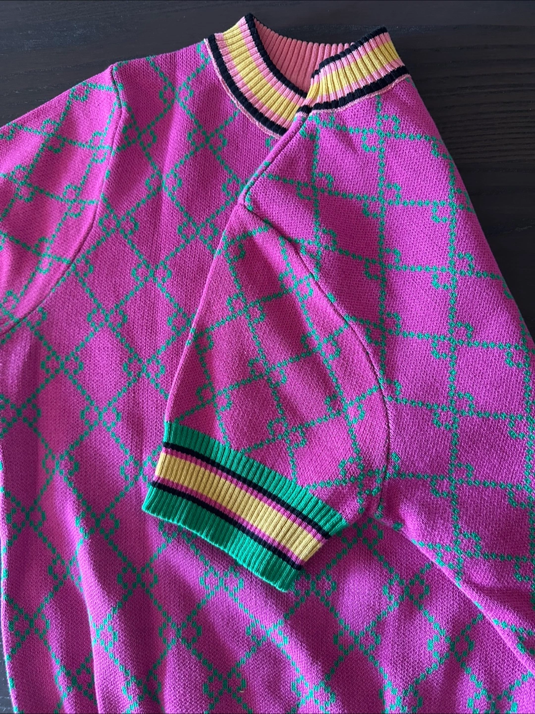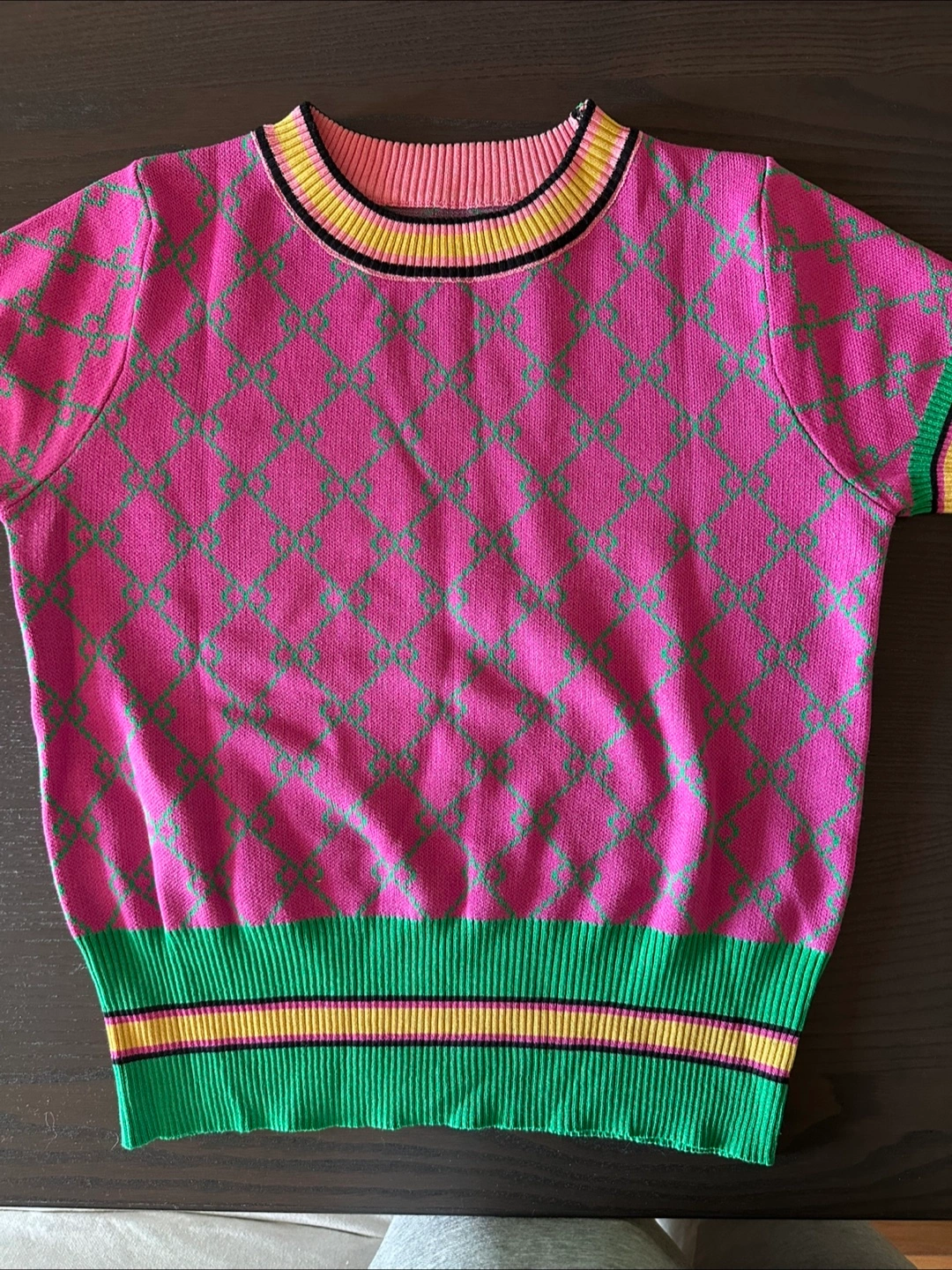 Features a repeating green pattern on a pink base. The neckline and sleeve cuffs have a contrasting design. Worn once, size M. Cash only, pick up downtown only.