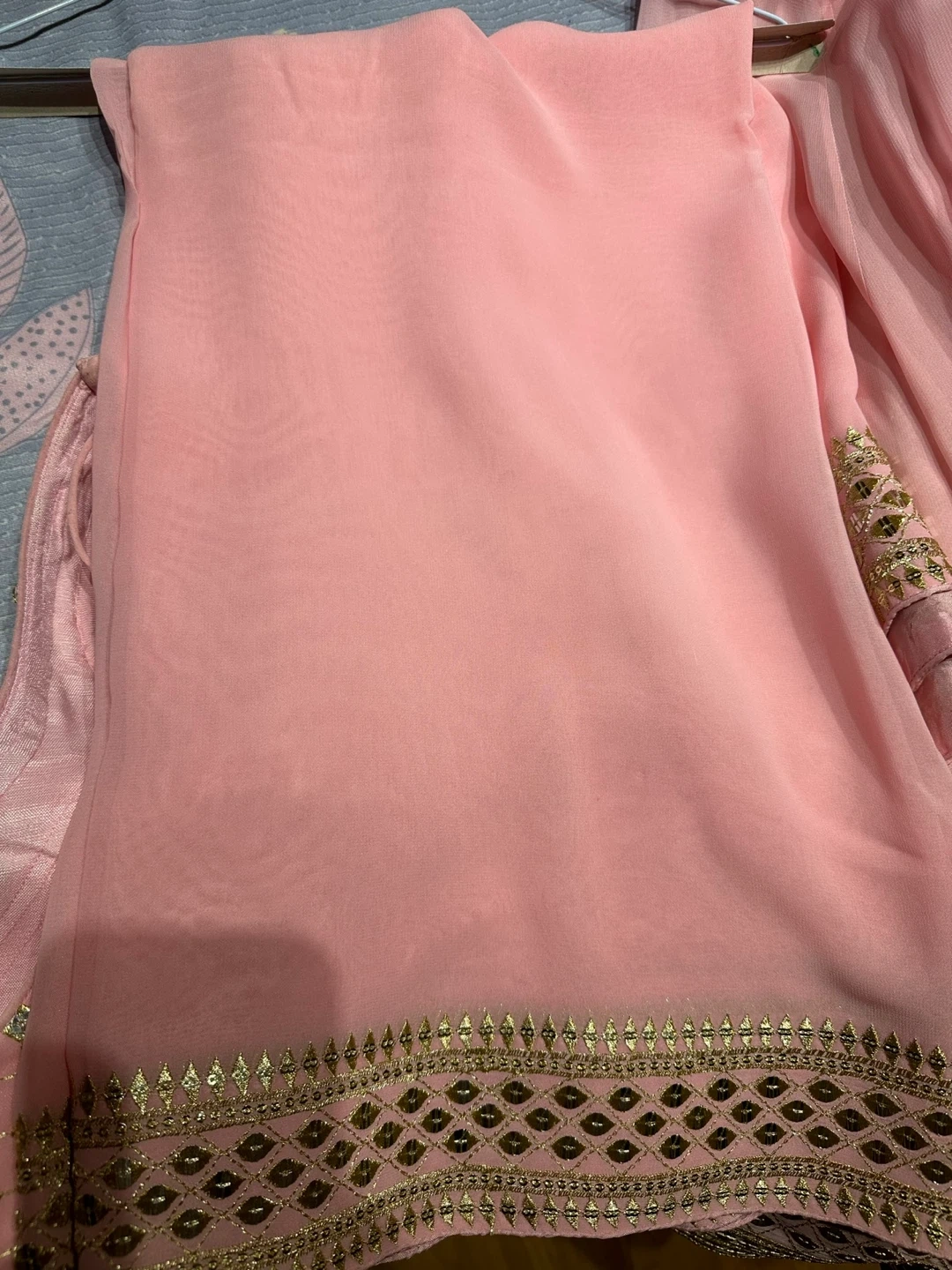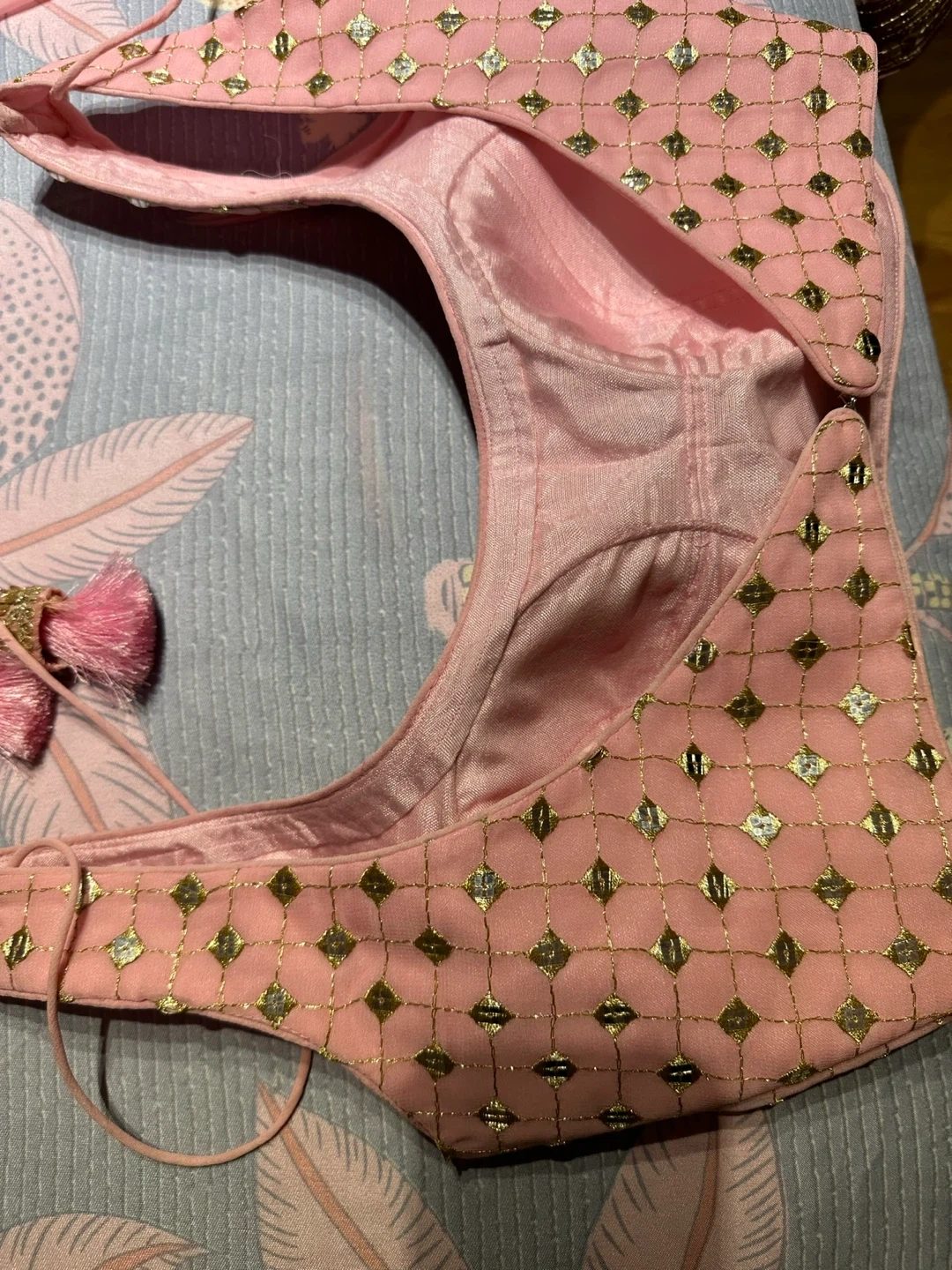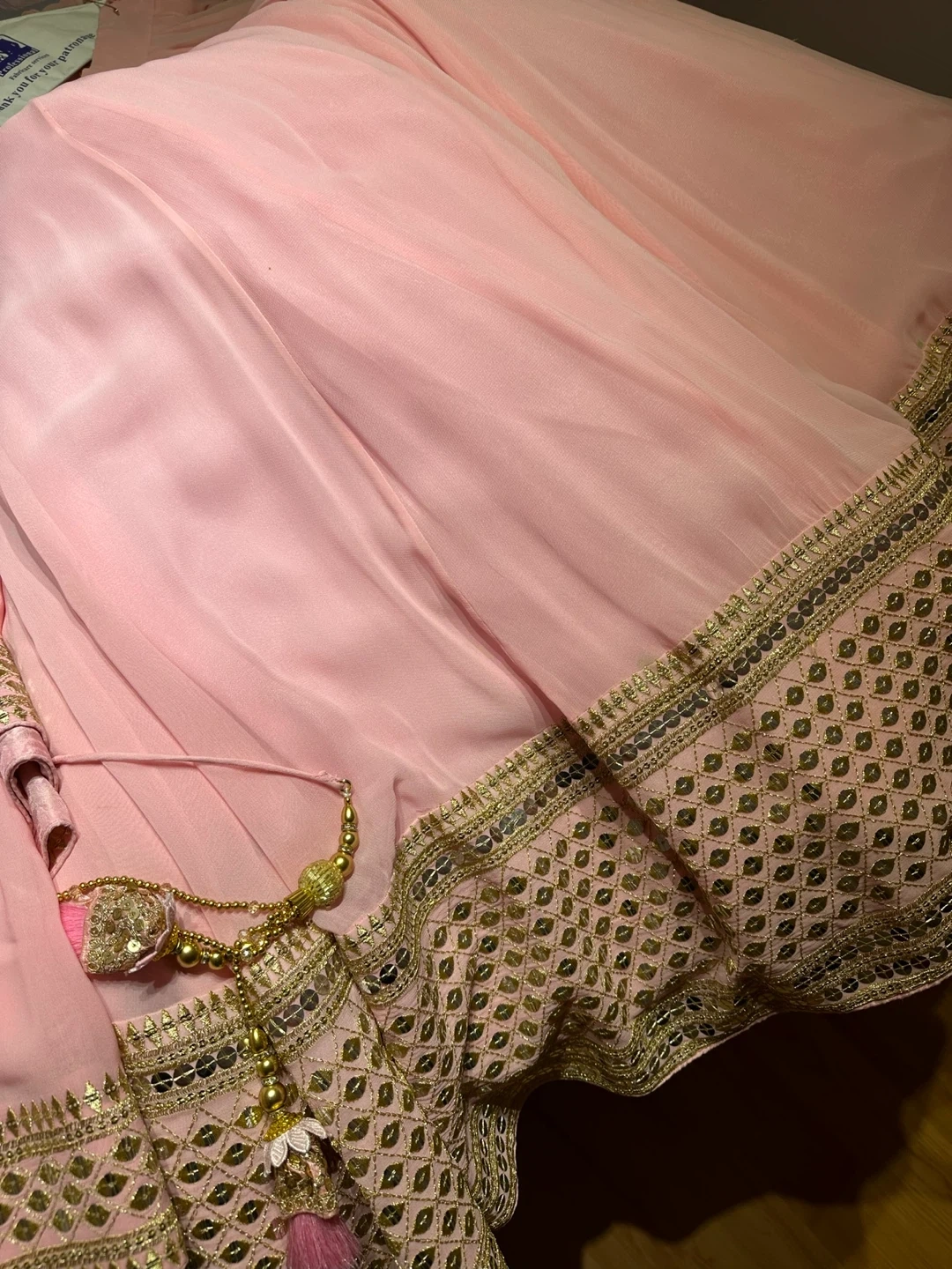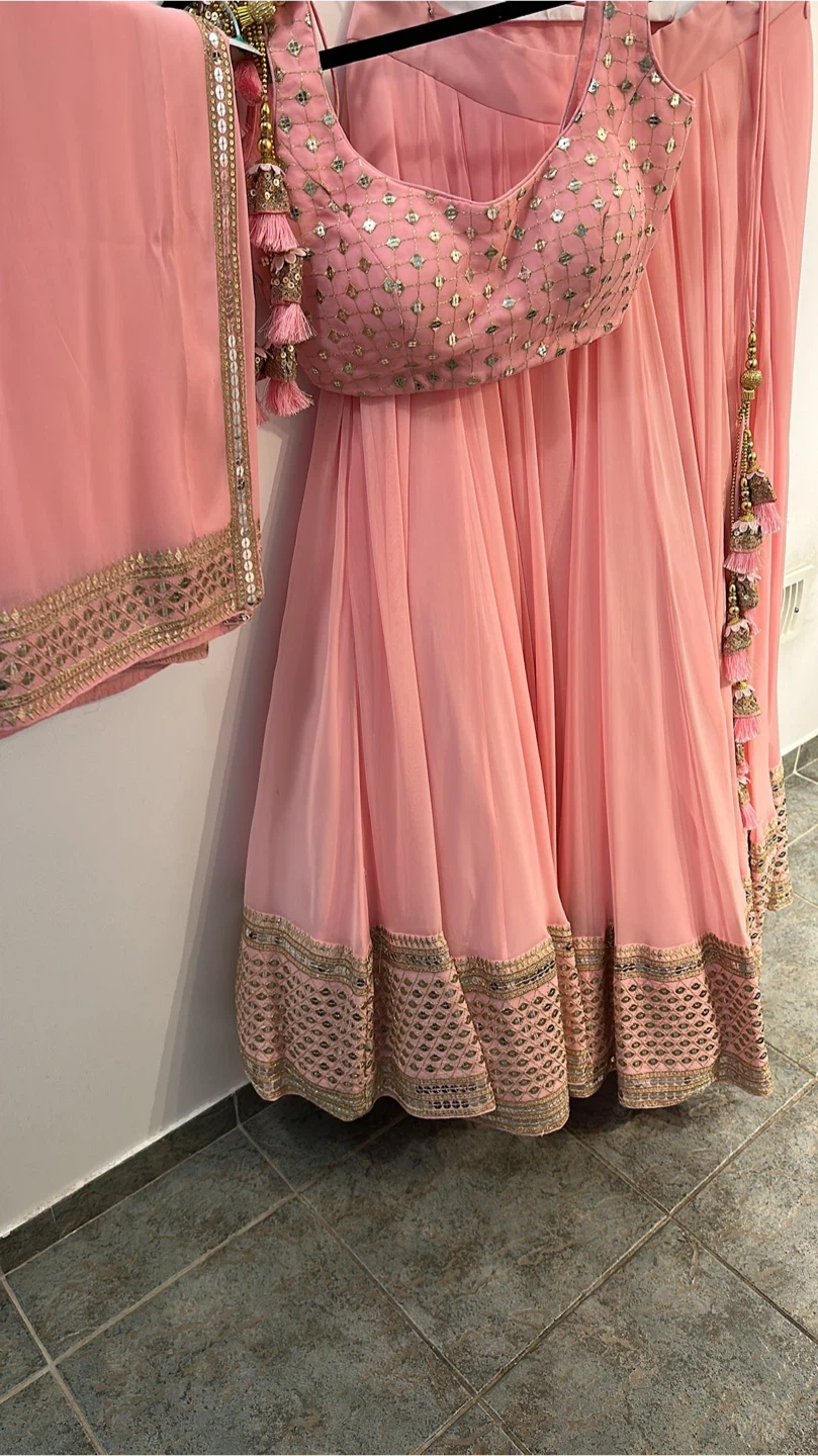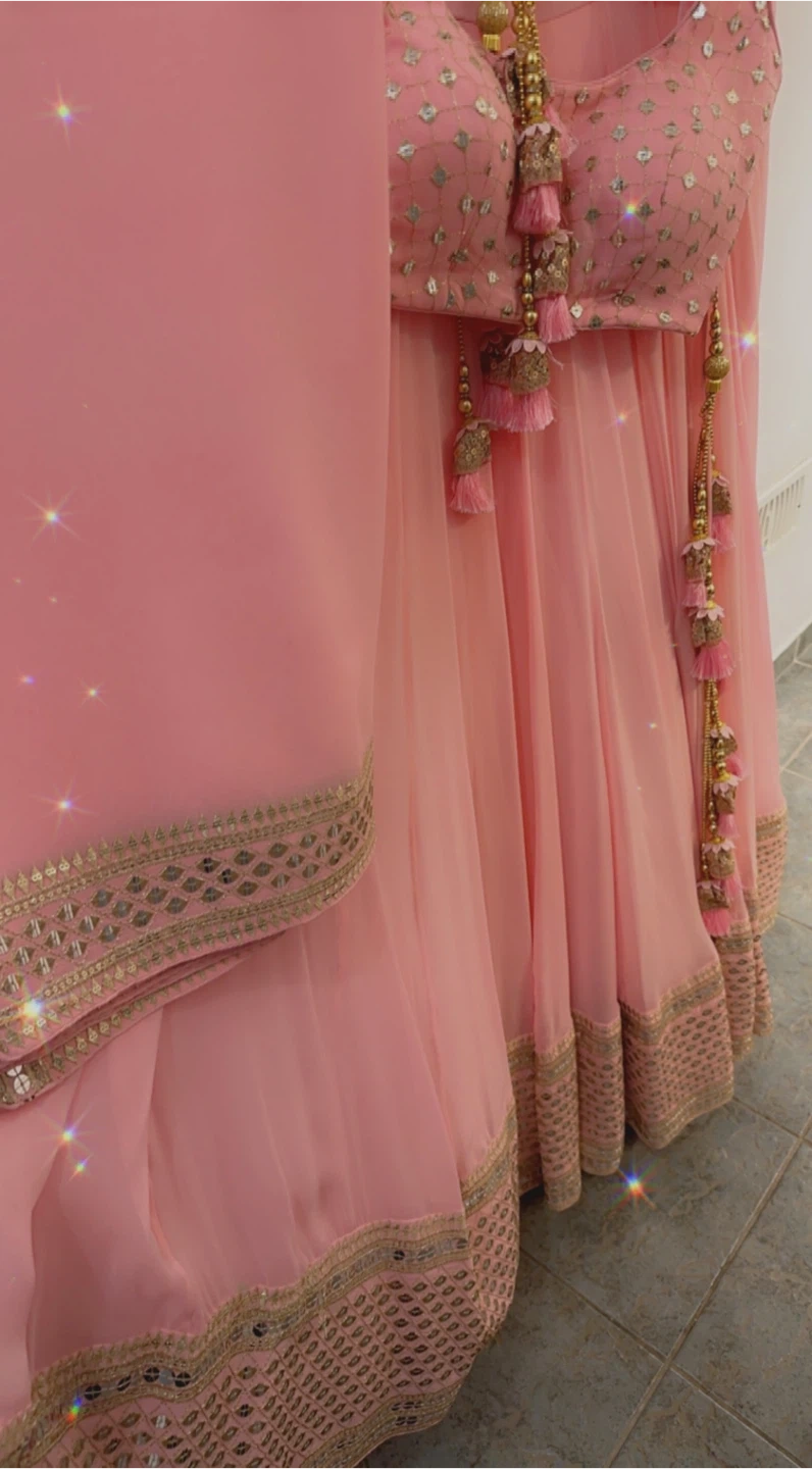 Beautiful pink lehenga choli set, perfect for special occasions! The set includes a lehnga, blouse, and dupatta, all adorned with gold embroidery and ready to wear for your next celebration