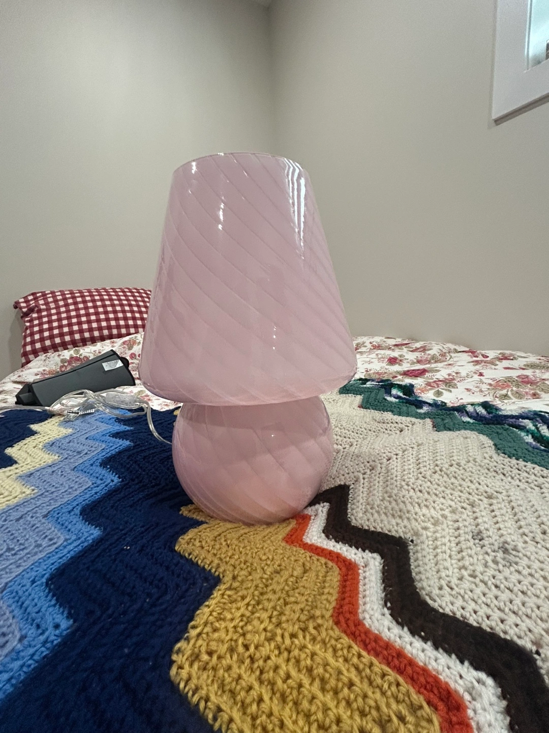 Selling a cute pink mushroom table lamp! It adds a soft and whimsical touch to any room. The lamp is in great condition and gives off a lovely, ambient light. Perfect for a bedside table or desk!