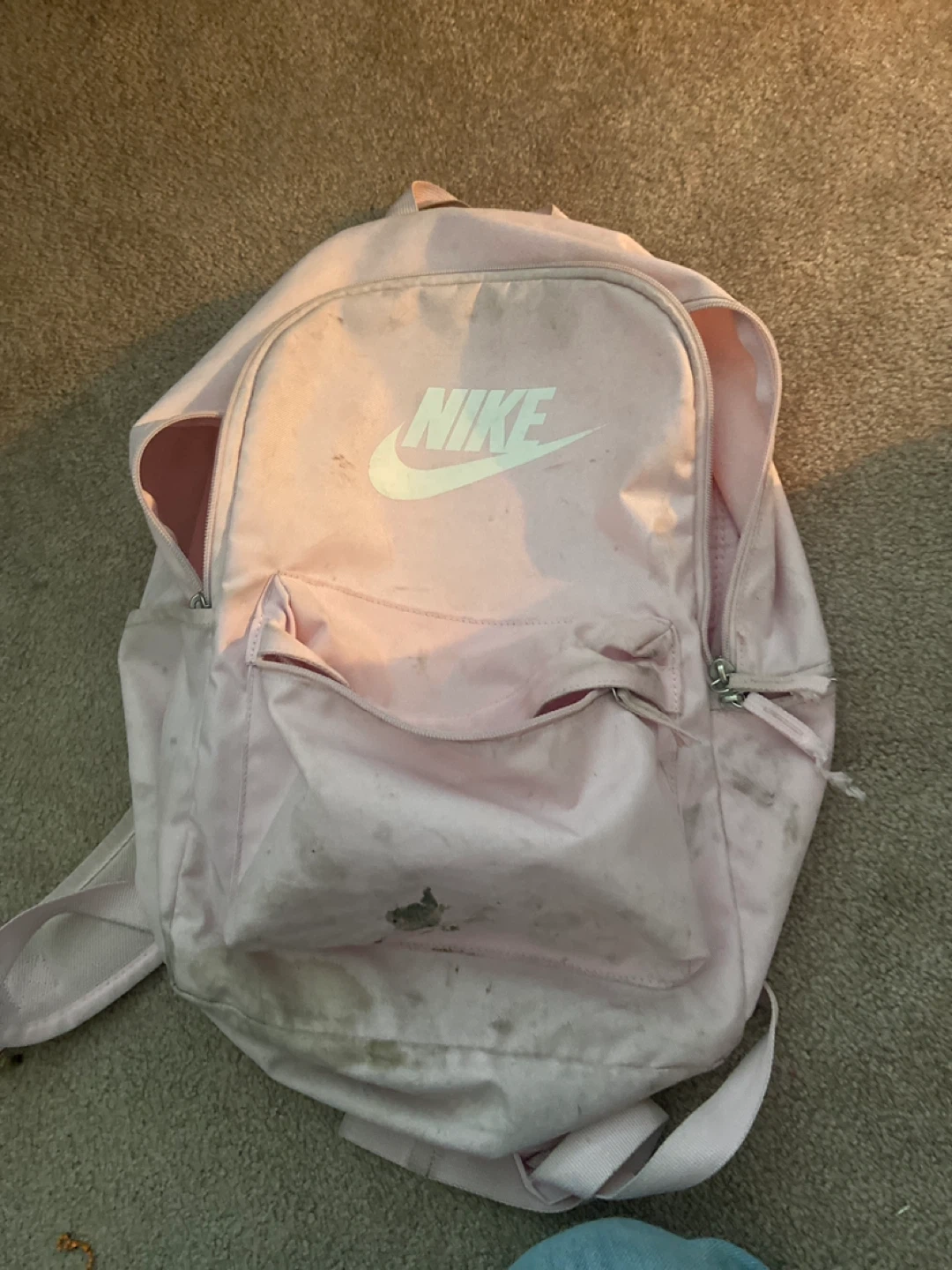 Selling a pink Nike backpack. It has some signs of wear, including some marks and stains as shown in the photos. Still a functional backpack!