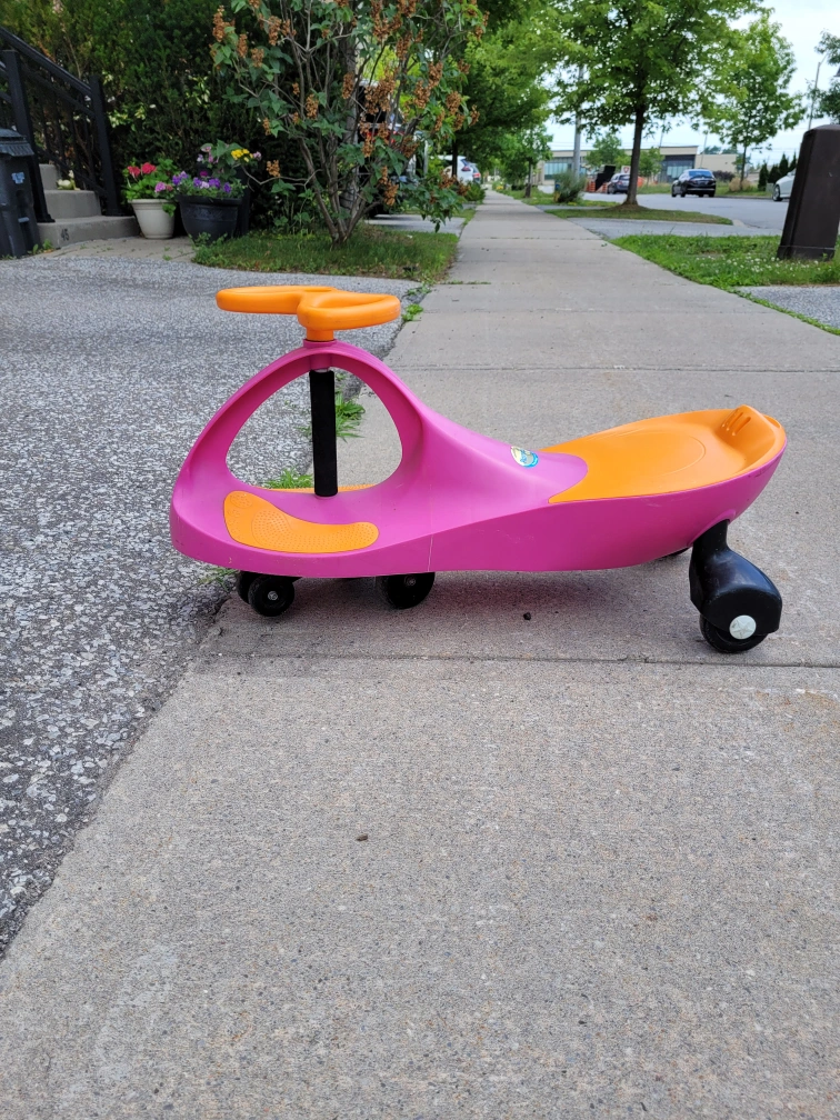 Selling a fun wiggle car! It's pink and orange, perfect for kids who love to ride around. It's in good condition and ready for a new home. Hours of fun!
