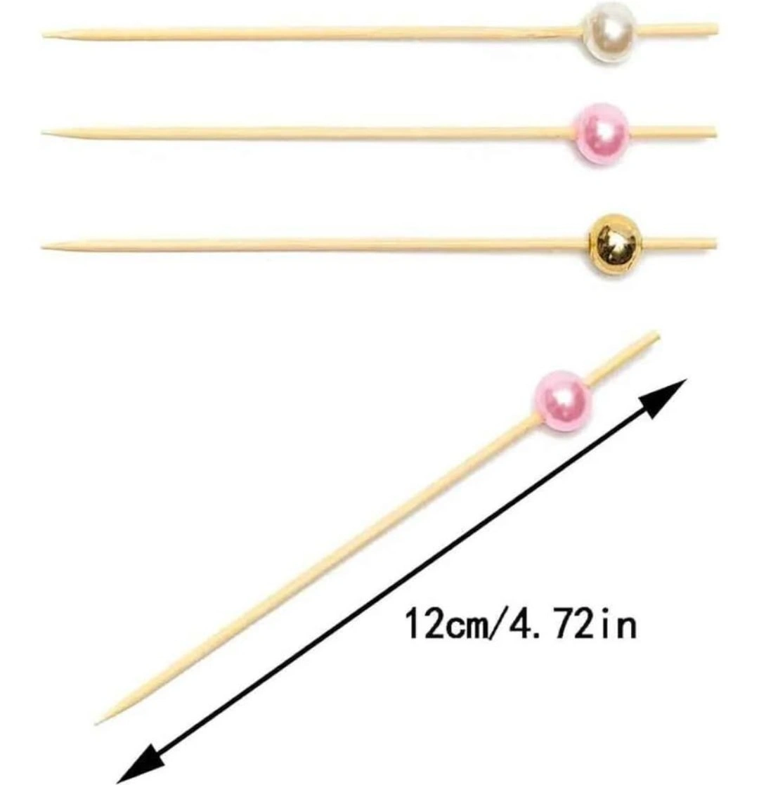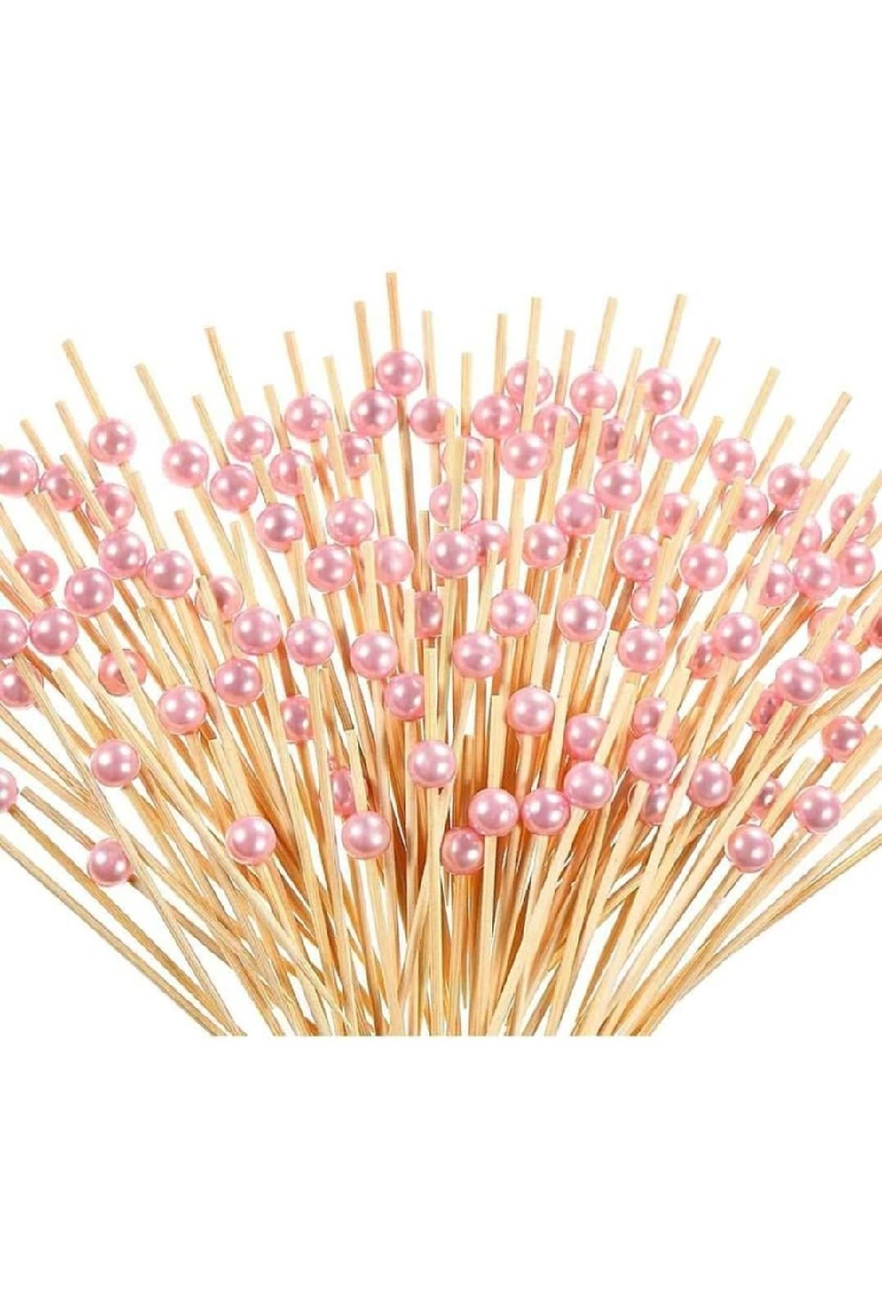 Pack of 100 pink pearl bamboo cocktail picks! Perfect for appetizers, cocktails, or any small bite. Each pick measures approximately 4.72 inches (12cm) in length.