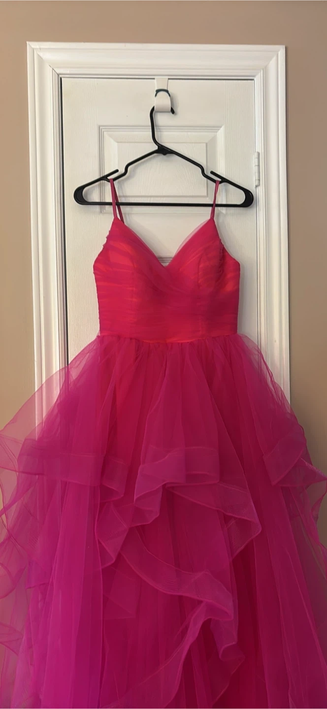 Selling a beautiful pink prom dress! It features a V-neck, spaghetti straps, and a layered tulle skirt. Got it altered on the waist and paid 150+ altogether, the belt is seperate for an extra 5 dollars