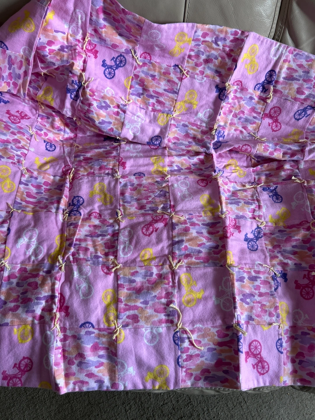 This is a pink quilt with a cute bicycle pattern. It's perfect for adding a touch of whimsy to any room. The quilt is in good condition and ready to be loved by its new owner!