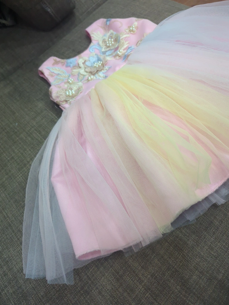 A beautiful dress with a rainbow tulle skirt and a pink bodice with floral embroidery! Perfect for parties or special occasions. It features a satin bow at the back. 3-6 months old