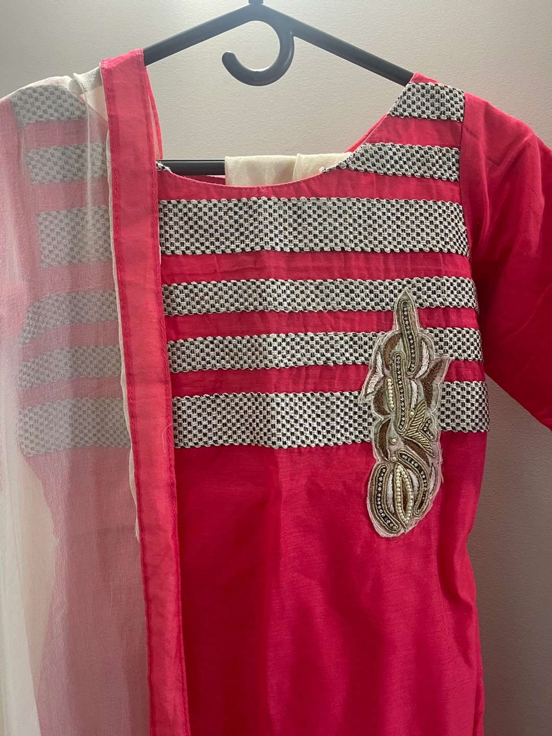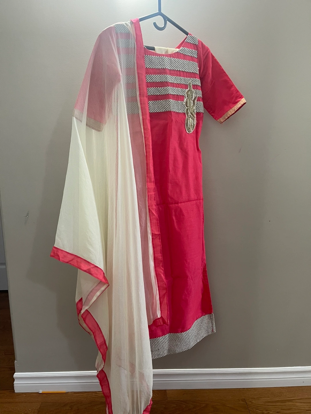 A beautiful pink salwar kameez suit. The suit has a pink and white dupatta. It's in great condition and ready for a new home