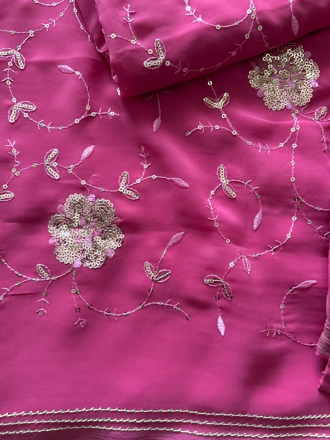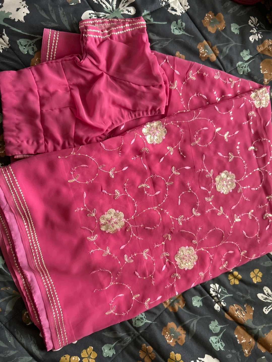 Selling a beautiful pink saree with delicate embroidery. It's in great condition and ready for a new home. The fabric is lightweight and drapes nicely, perfect for special occasions or cultural events. The set includes the saree and a matching blouse piece.