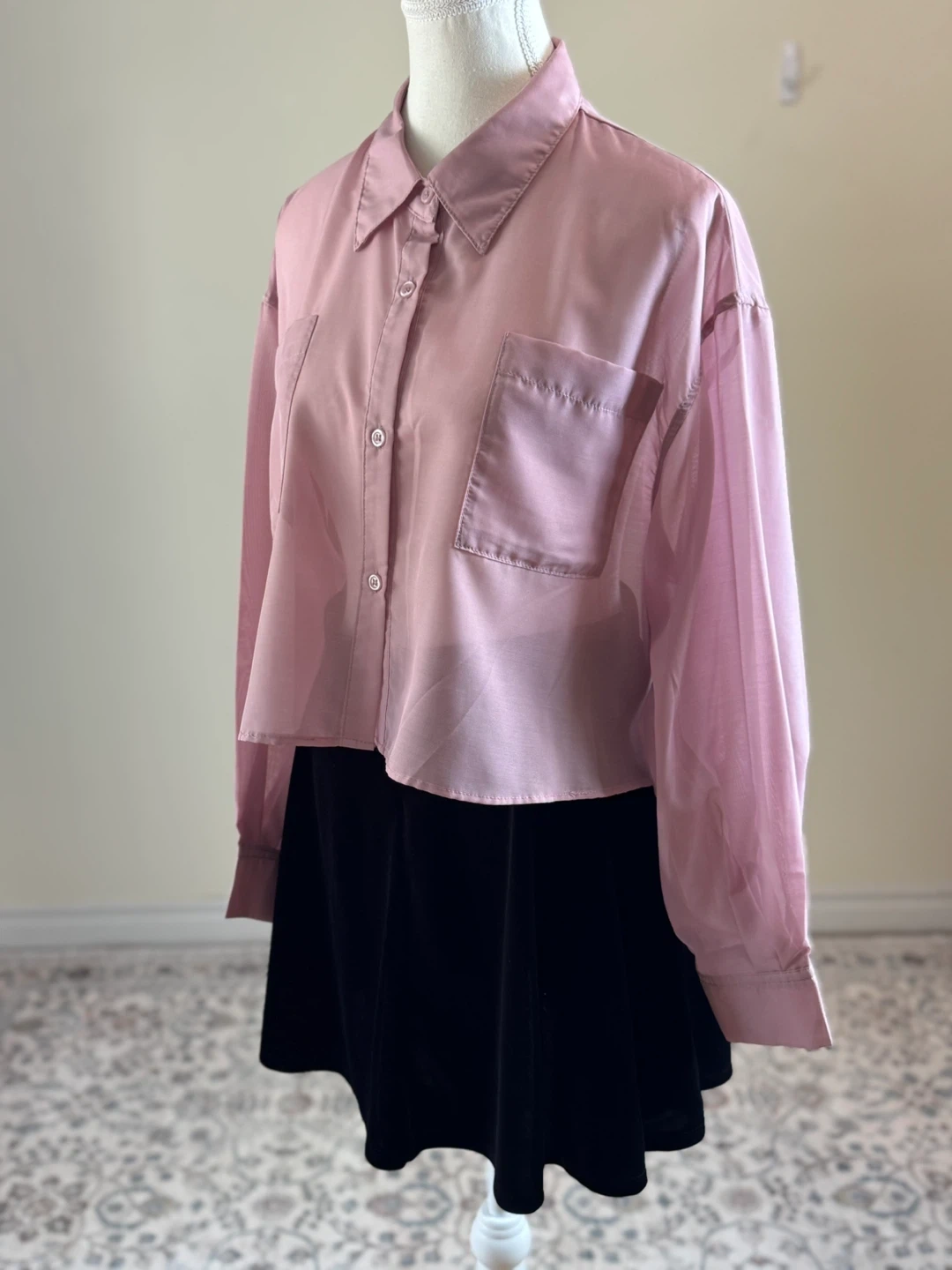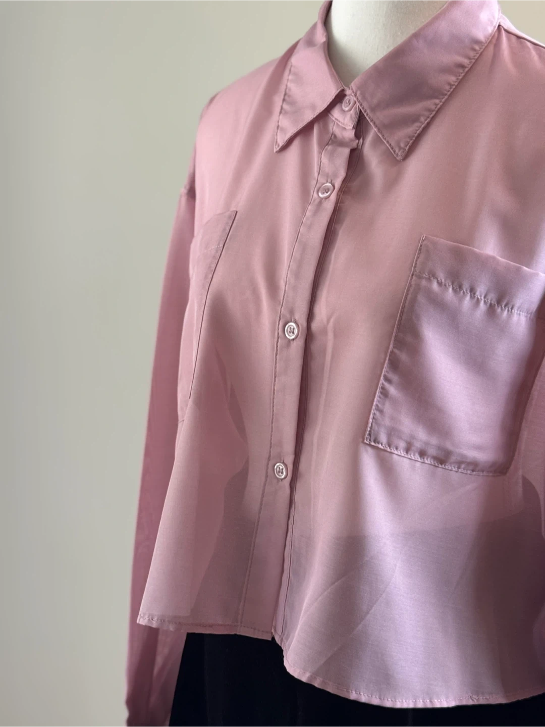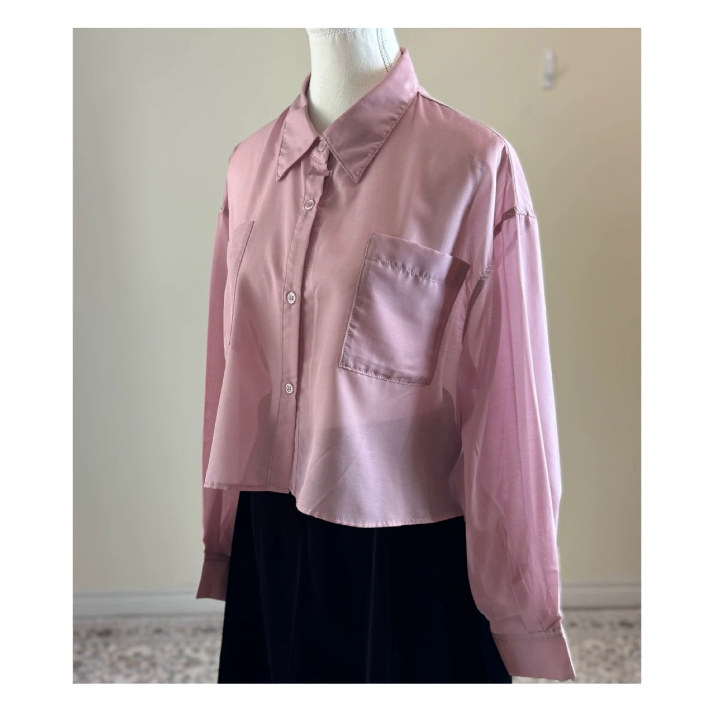 π Description: A chic and lightweight pink cropped shirt, designed with a sheer polyester fabric for a stylish layered look. Featuring a classic collar, button-down front, and dual chest pockets, this shirt brings a perfect mix of elegance and casual flair. The cropped cut makes it versatile for pairing with high-waisted jeans, skirts, or layering over dresses. β Material: β’ 100% Polyester β Size: Flat Measurements β’ Chest (pit to pit): 60 cm (23.6β) β’ Total Length: 47 cm (18.5β) β’ Tagged Size: M (fits closer to SβM for Women depending on desired fit) Please refer to detailed measurements for best fit. β Features: β’ Lightweight sheer(compeletely) fabric β perfect for layering β’ Cropped cut for a trendy silhouette β’ Classic collar with button-down closure β’ Long sleeves with button cuffs β’ Dual chest pockets π Condition: β’ Overall in excellent vintage condition. Due to the nature of vintage items, there may be minor signs of wear, such as slight stains or small imperfections. β Great for layering over camisoles or dresses β Stylish cropped length for a modern look β Perfect for casual, office, or evening styling