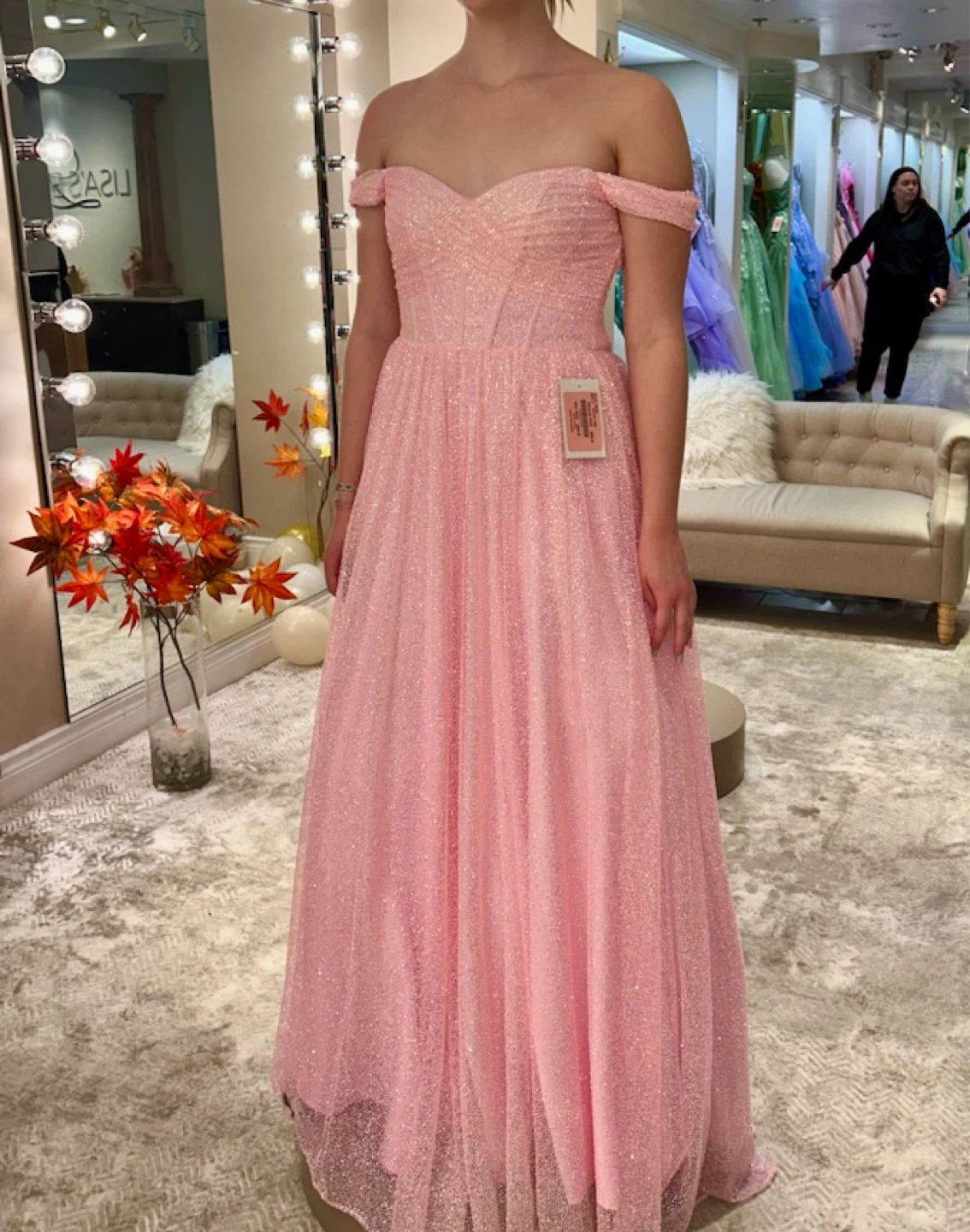 Selling a beautiful pink, sparkly, off-the-shoulder prom dress. It's in great condition and ready for a new owner to shine in! I am 5 foot 8 inches and normally a size medium in clothing. This was tailored to my body, but the ties at the back allow flexible sizing to the torso and bust. It may need to have the string replaced however, as the day of we realized it was fairly thin. We bought this on sale at Lisa’s Bridal for around $650 and I will accept anything above $300.