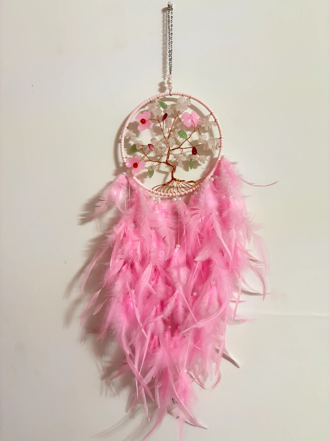 Add a touch of whimsy to your space with this charming pink dream catcher with crystals! It features a delicate "tree of life" design with pink flowers and feathers. Perfect for a bedroom or nursery.