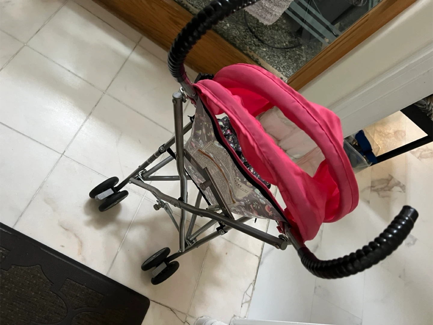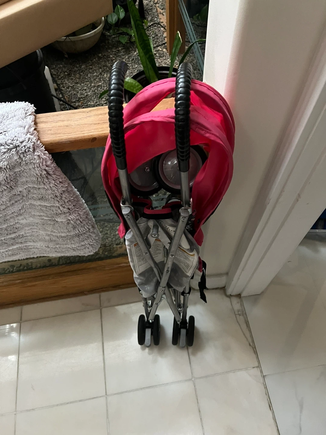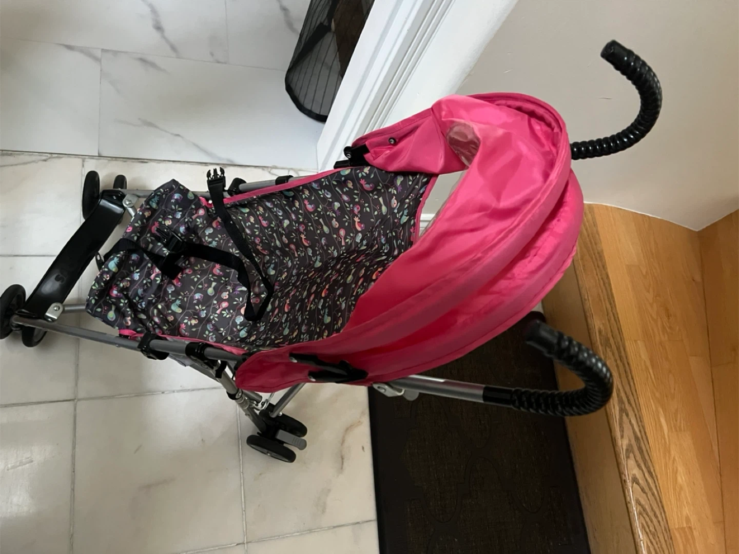 Selling a lightweight pink umbrella stroller. It's in great condition and perfect for quick trips around town! The stroller features a fun printed fabric on the seat and is easy to fold up for storage or travel