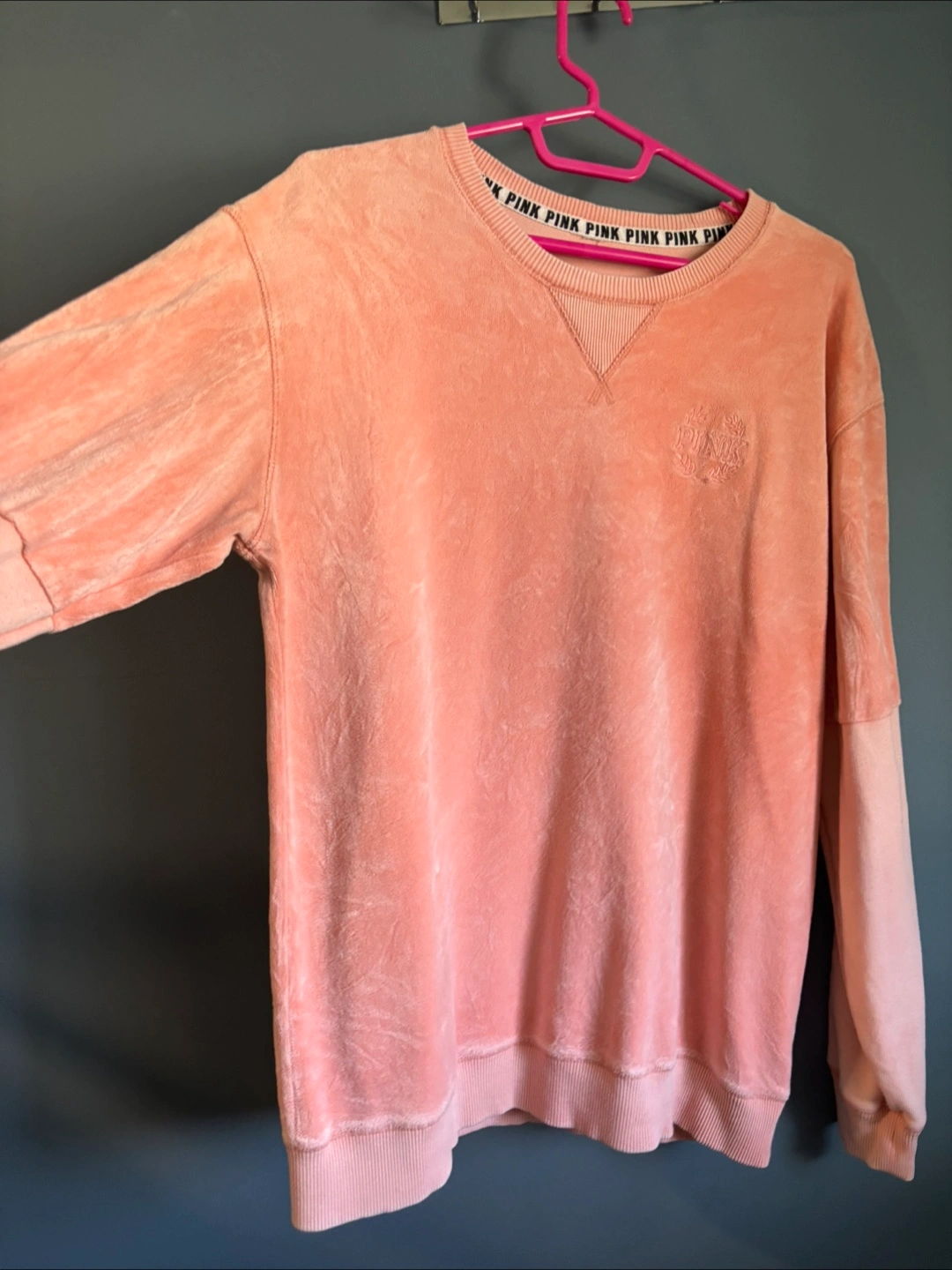 Cozy PINK Victoria's Secret velour sweatshirt in a lovely peach colour! Perfect for lounging around the house or running errands. It's in great condition and ready for a new home