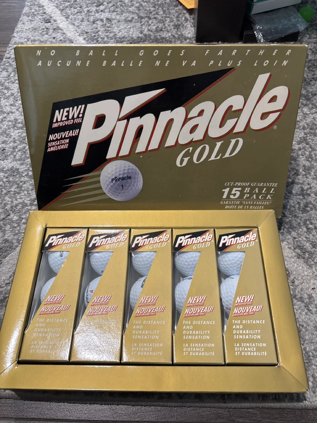 Selling a brand new pack of Pinnacle Gold golf balls! The box includes 15 balls, perfect for hitting the links. These balls are designed for distance and durability, so you can play your best game. Get ready to improve your sensation on the course!