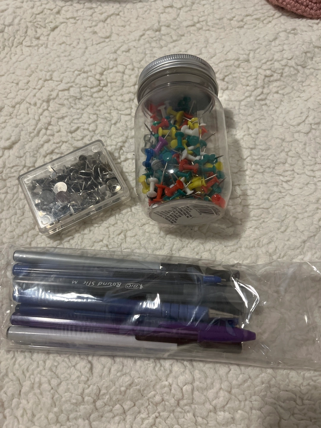 25Jar of colourful push pins, a small container of silver push pins, and a package of pens. Free Pick up Only