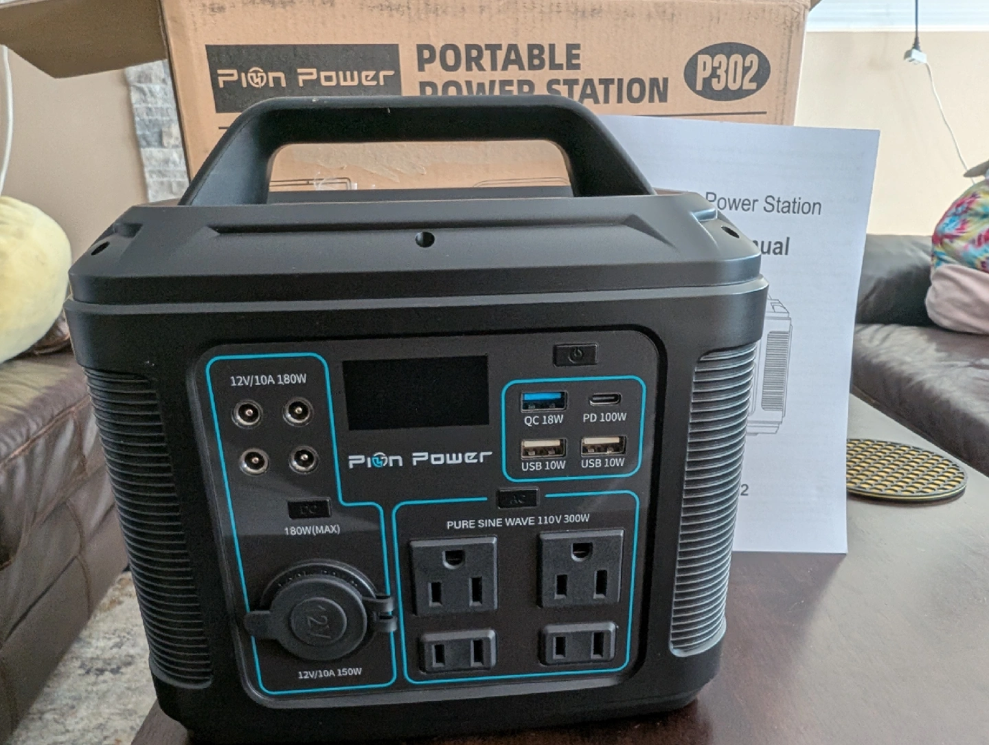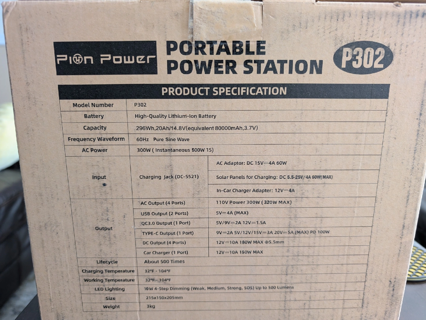 Selling a Pion Power P302 Portable 300W Power Station. It's brand new & comes with the original box and manual! Features: - High-Quality Lithium-Ion Battery - Capacity: 296Wh, 20Ah/14.8V (equivalent 80000mAh, 3.7V) - AC Power: 300W (Instantaneous 500W) - Pure Sine Wave 110V 300W - USB Output (2 Ports): 5V=4A - QC3.0 Output (1 Port): 5V/9V=2A 12V=1.5A - TYPE-C Output (1 Port): 5V=2A 5V/12V/15V=3A 20V=5A (MAX) PD 100W - DC Output (4 Ports): 12V=10A 180W MAX 95.5mm - Car Charger (1 Port): 12V=10A 150W MAX - Size: 215x150x205mm - Weight: 3kg