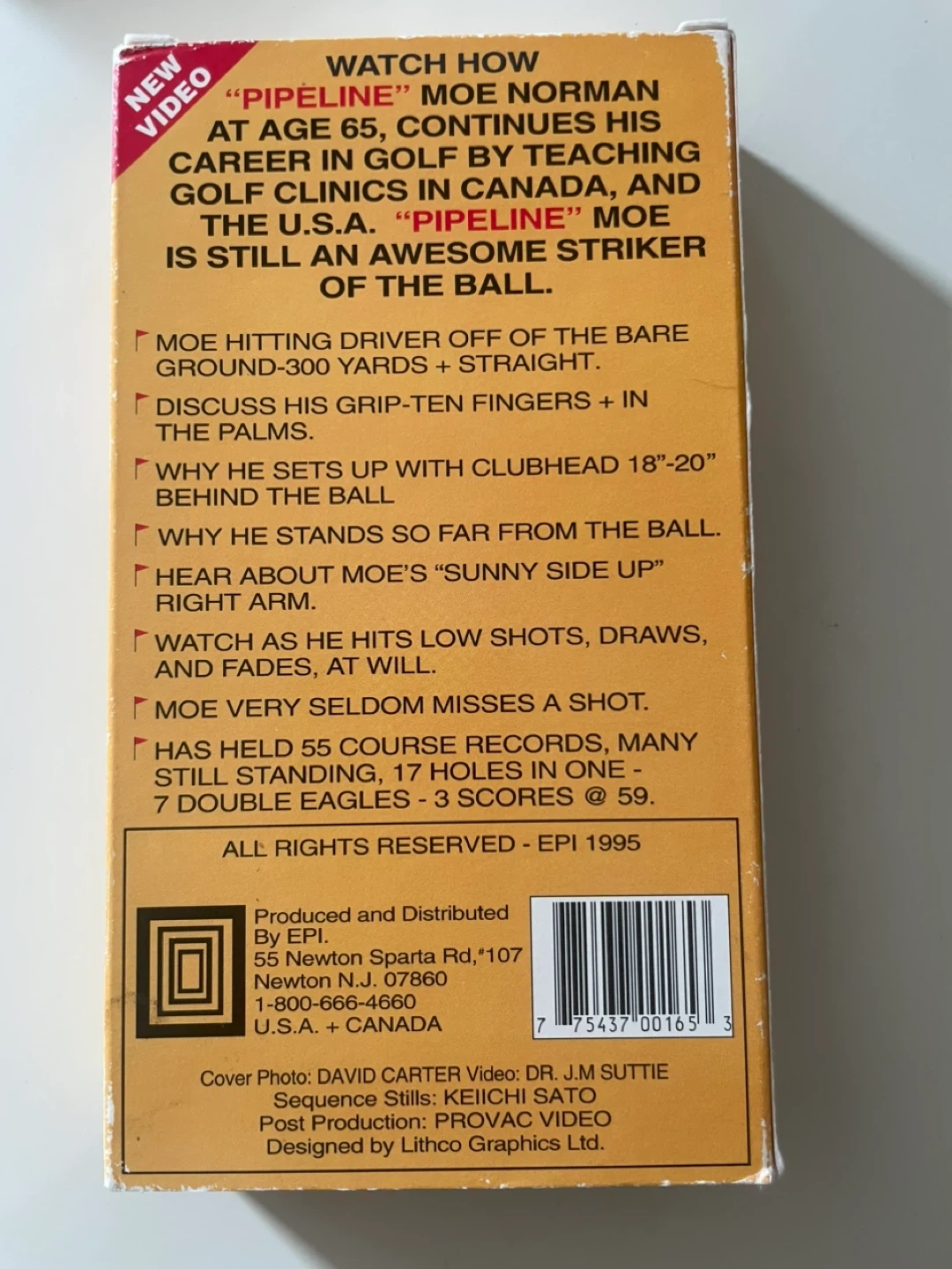 Selling a super RARE VHS tape titled "Pipeline Moe Norman Golf Clinic"! It provides a unique look at the swing, talent, and life of golf's best ball striker. Learn how Pipeline Moe Norman continues his career at age 65 by teaching golf clinics in Canada and the U.S.A. Produced by EPI in 1995, this VHS tape runs for 60 minutes