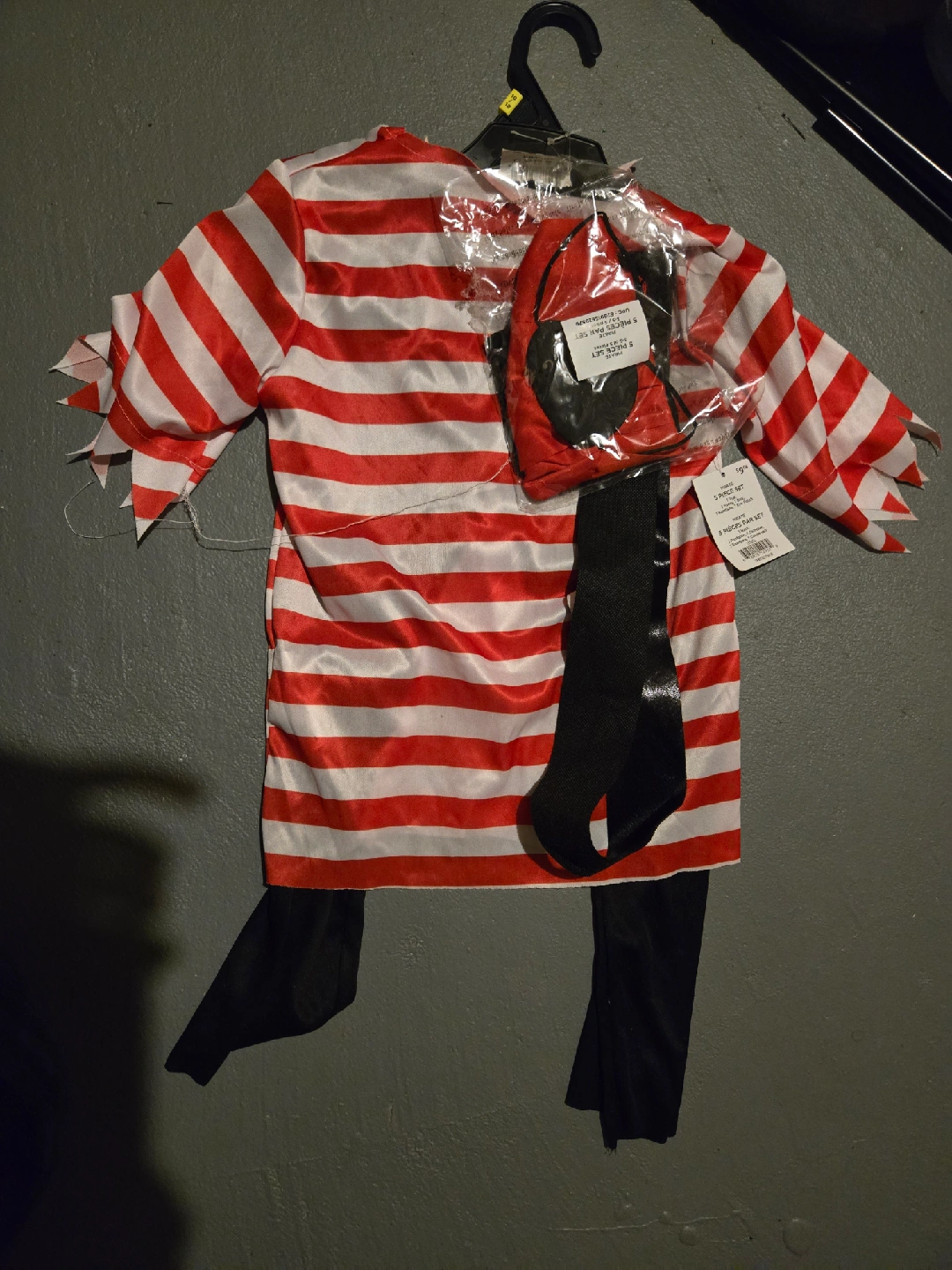 Here's a pirate costume, a 5 piece set! It includes a red and white striped shirt, black pants, and a black eye patch. Great for Halloween or dress-up!