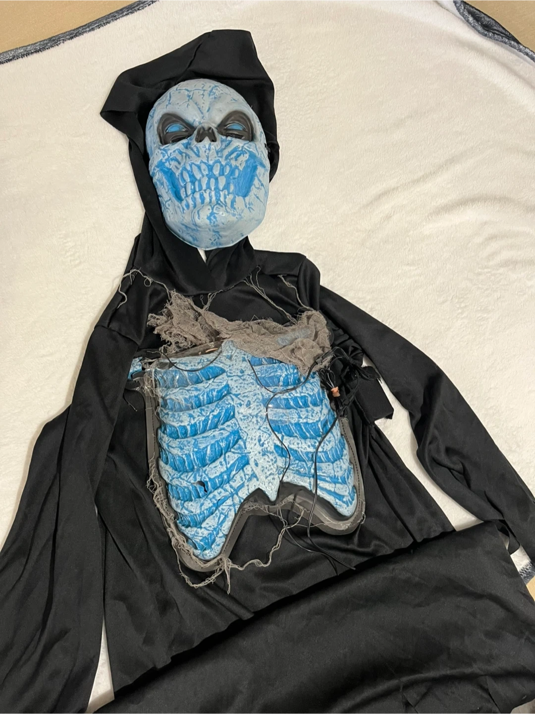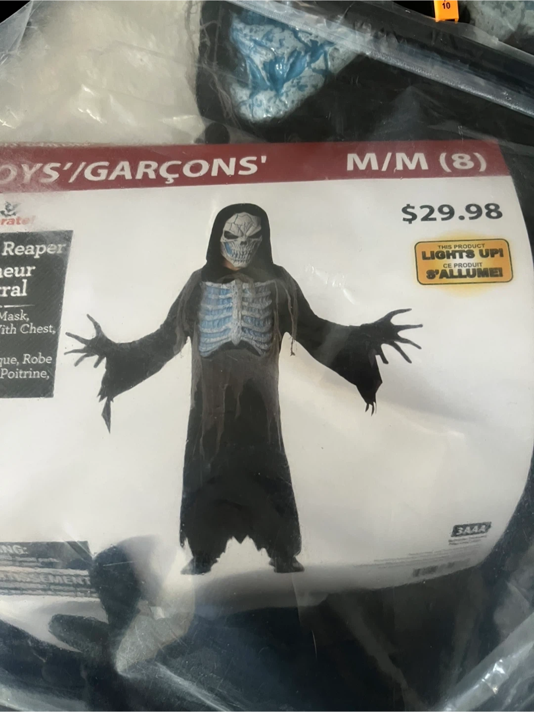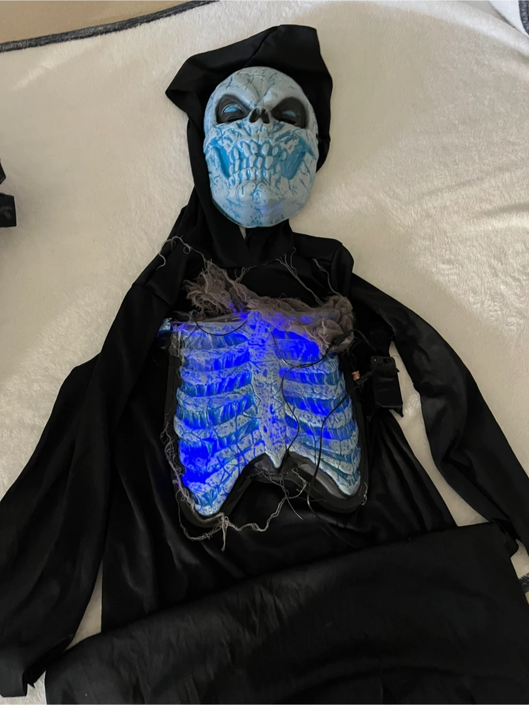 Spectral Reaper costume for boys, size M/M (8). This costume features a mask and robe with a chest piece that lights up!