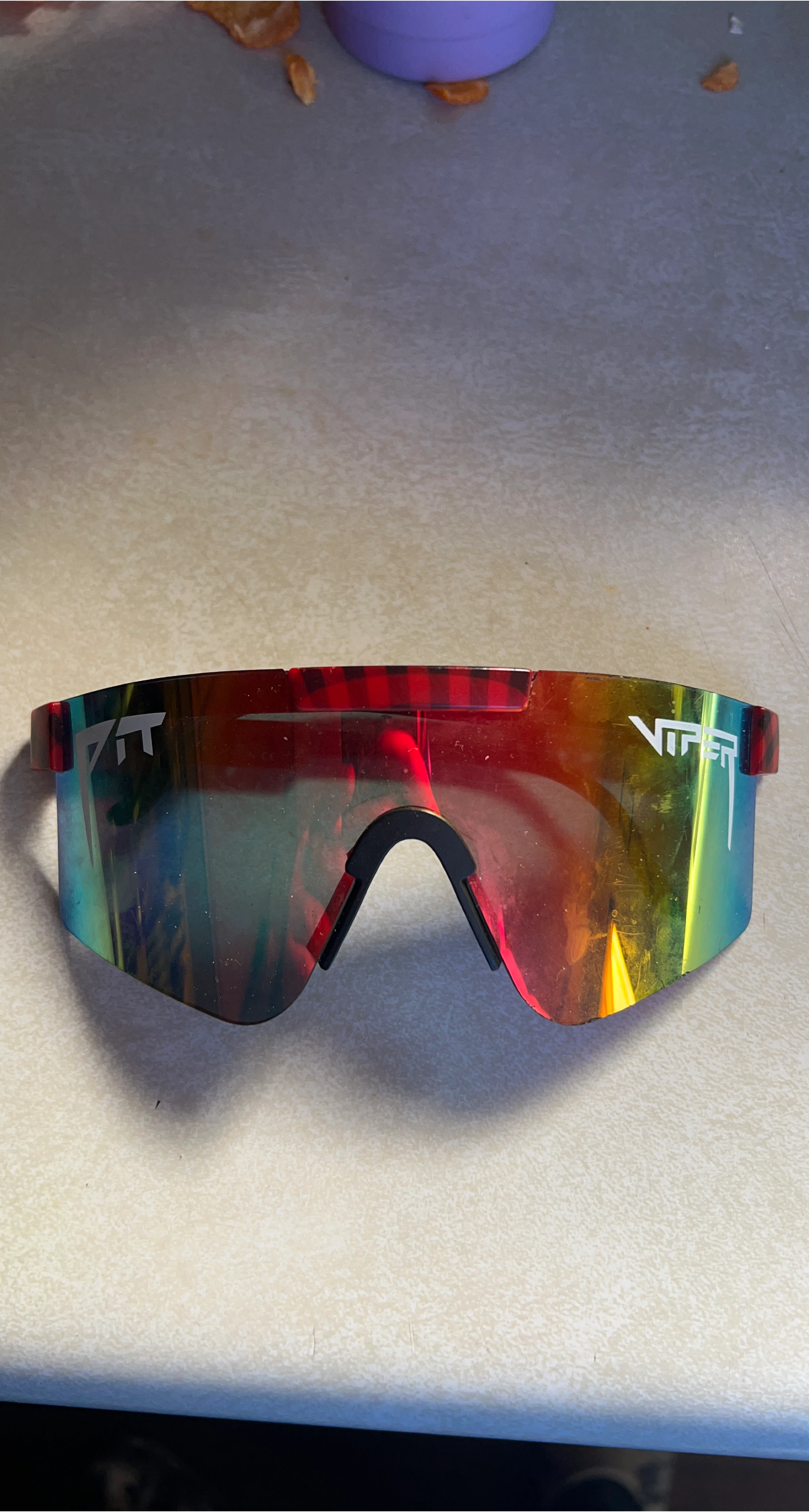 Selling a pair of Pit Viper sunglasses. They have a red and rainbow reflective lens and a red checkered pattern on the top of the frame. They are in good condition!