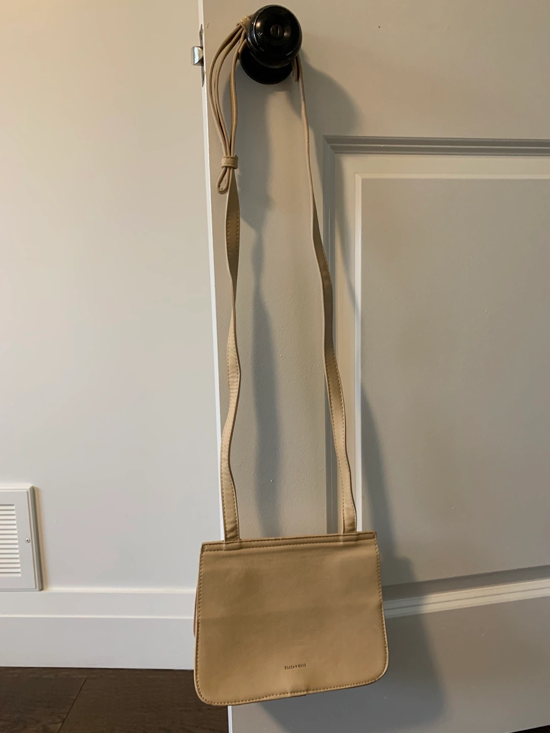 Beige crossbody bag. Shoulder strap. Flap with a button closure. Features interior pockets. A perfect bag for everyday essentials, ensuring your peace of mind throughout your day.