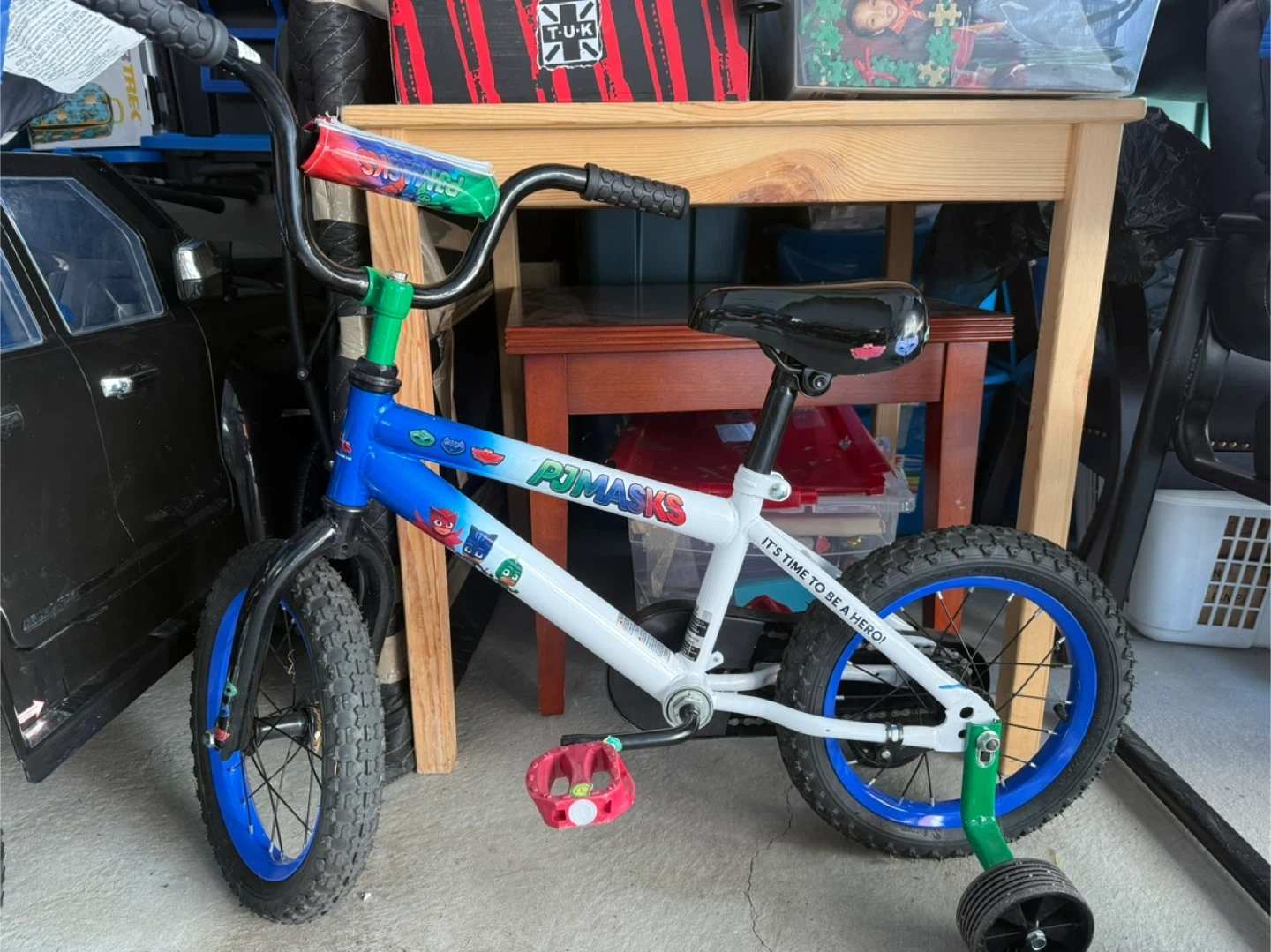 Selling a PJ Masks themed kids' bike. It's white and blue with PJ Masks characters and logos. It reads "It's time to be a hero!" on the frame. Great for a young fan!