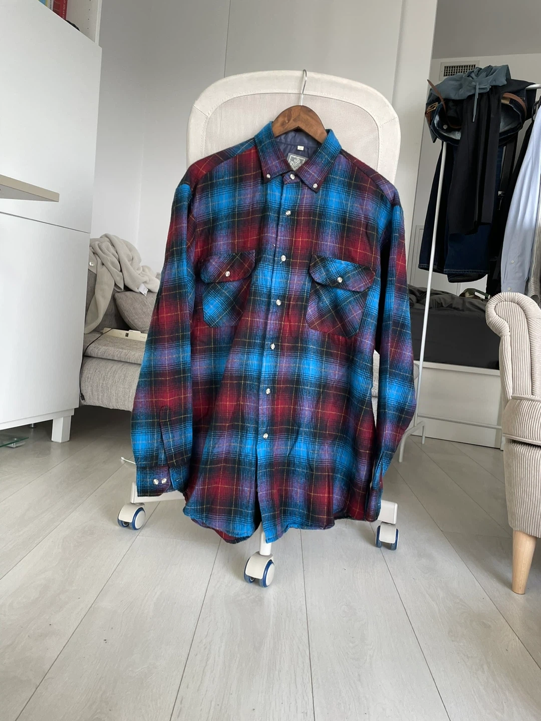 This shirt features a vibrant mix of blue, red, and purple in a timeless plaid pattern. Perfect for adding a touch of warmth and style to your wardrobe