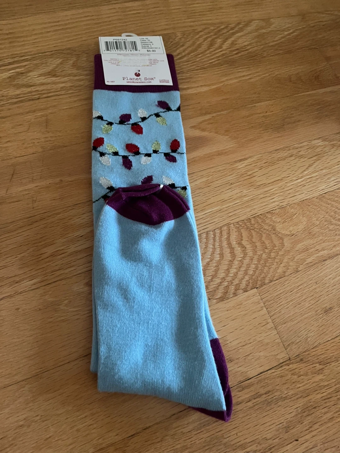 These Planet Sox holiday socks are brand new with tags! They feature a cute light string design on a light blue sock with a purple toe, heel, and cuff. Perfect for adding a festive touch to your outfit