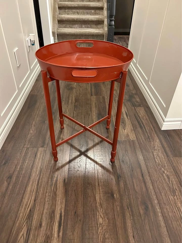 Red round top table/stand with removable top to possibly be used as a tray. Comes from smoke free home with measurements of 24” high x 18.5” diameter. Quite a few paint scratches/fades so might require touchups or repainting. Pickup in Dundas and Landsdowne area of Woodstock.