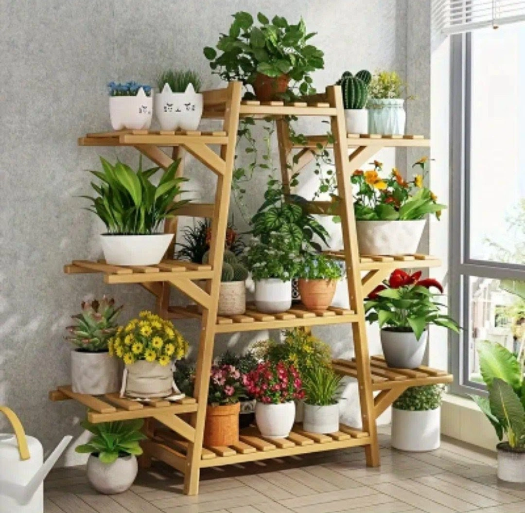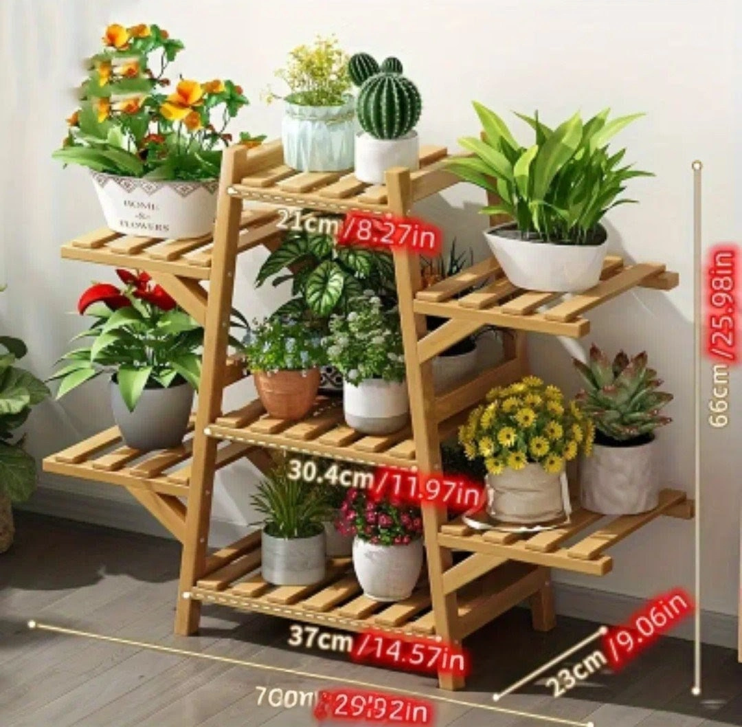 Wood plant stands, estimated measurements 29.92" L x 25.89" H x 9.06" W. 7 tiers. $40. Price firm. Wood plant stands, estimated measurements 34.25" L x 37.4" H x 9.06" W. 9 tiers. $60. Price firm.