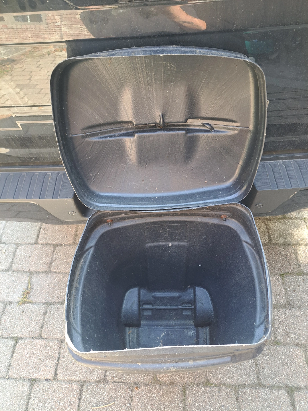 Good shape plastic garbage bin with lid. Has 2 wheels to make moving a full bin easy.