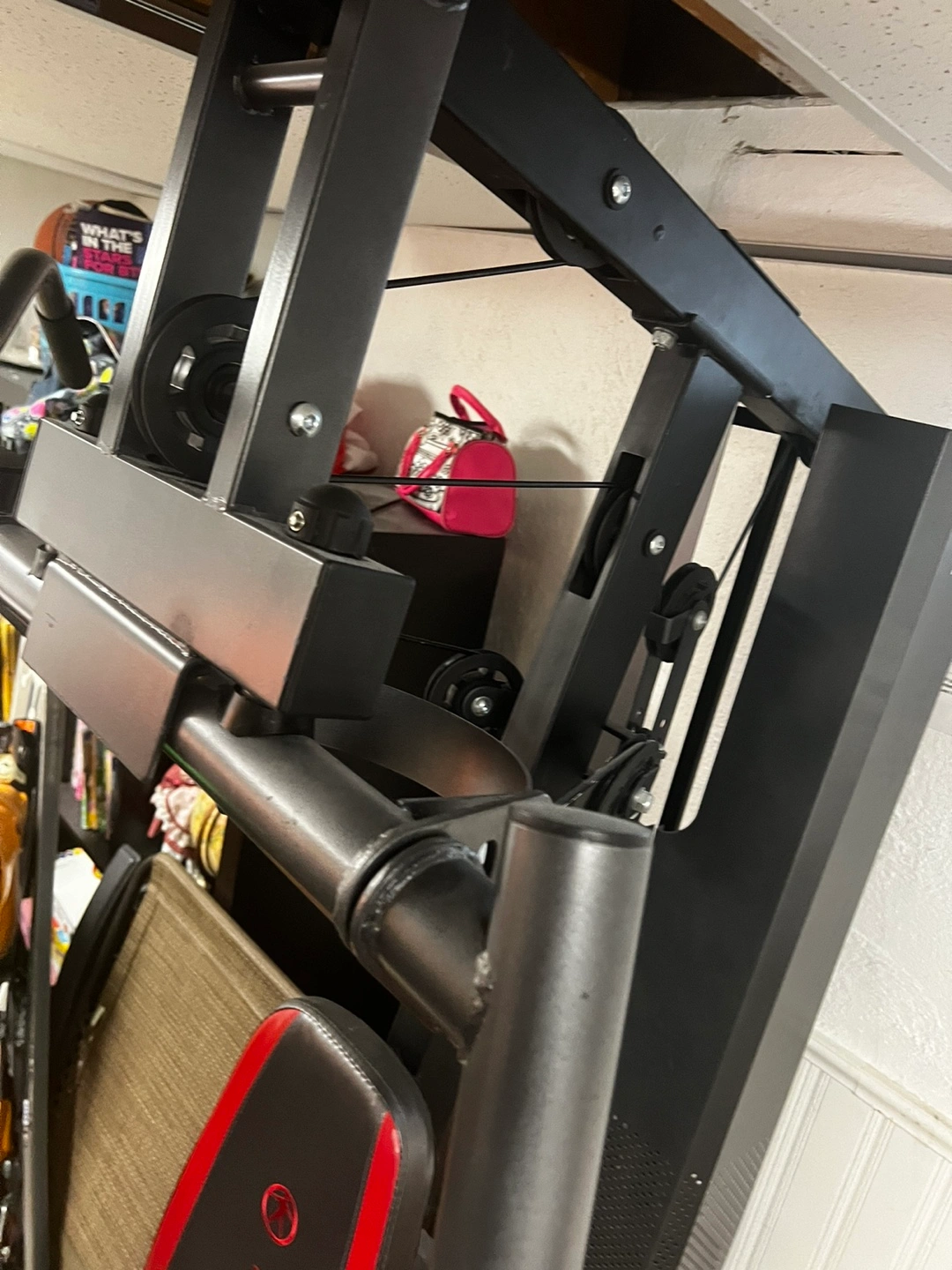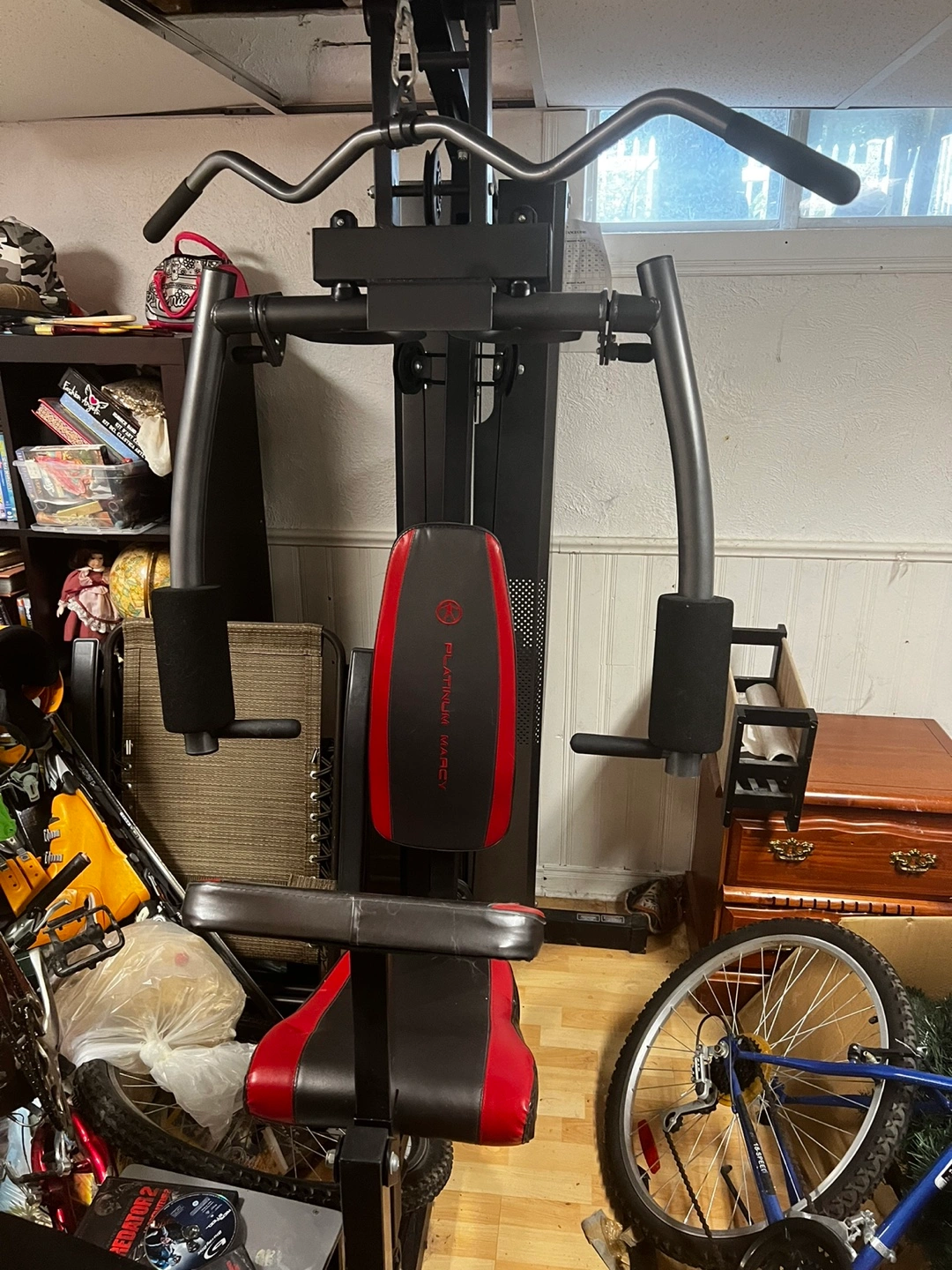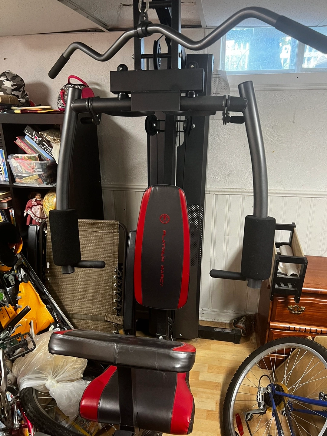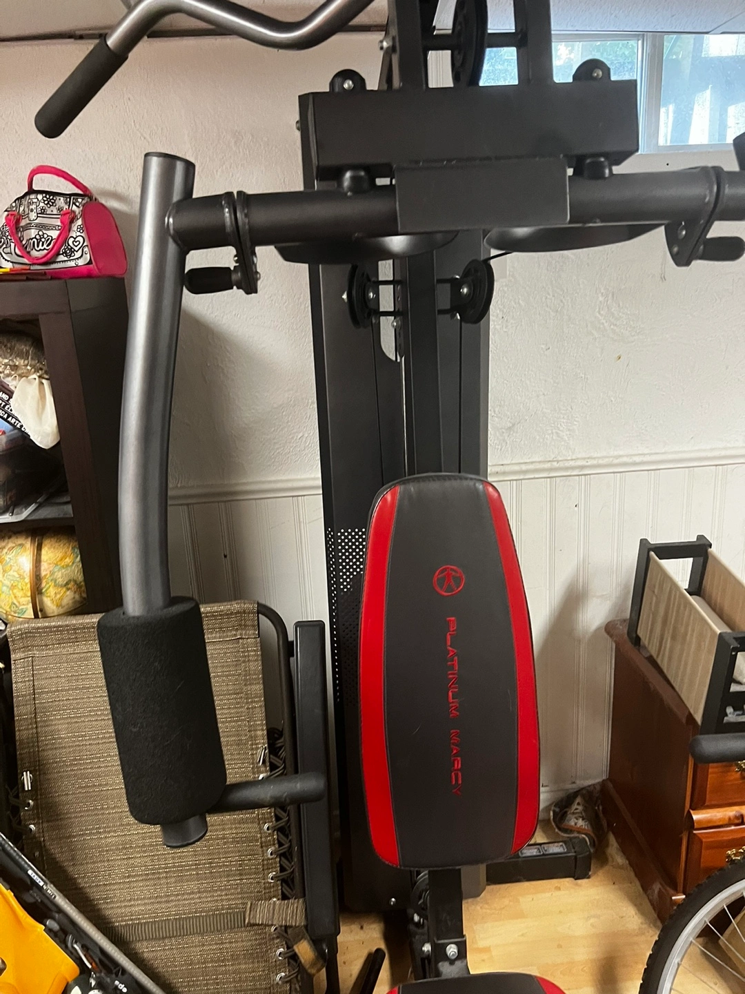Show allThis gym includes a lat pull down, bench press, and various other exercises. It also has a weight stack for resistance. Please note that total weight is 150 pounds.