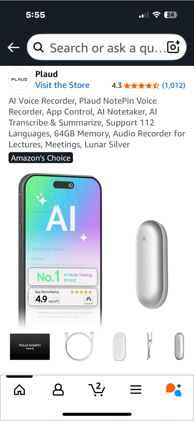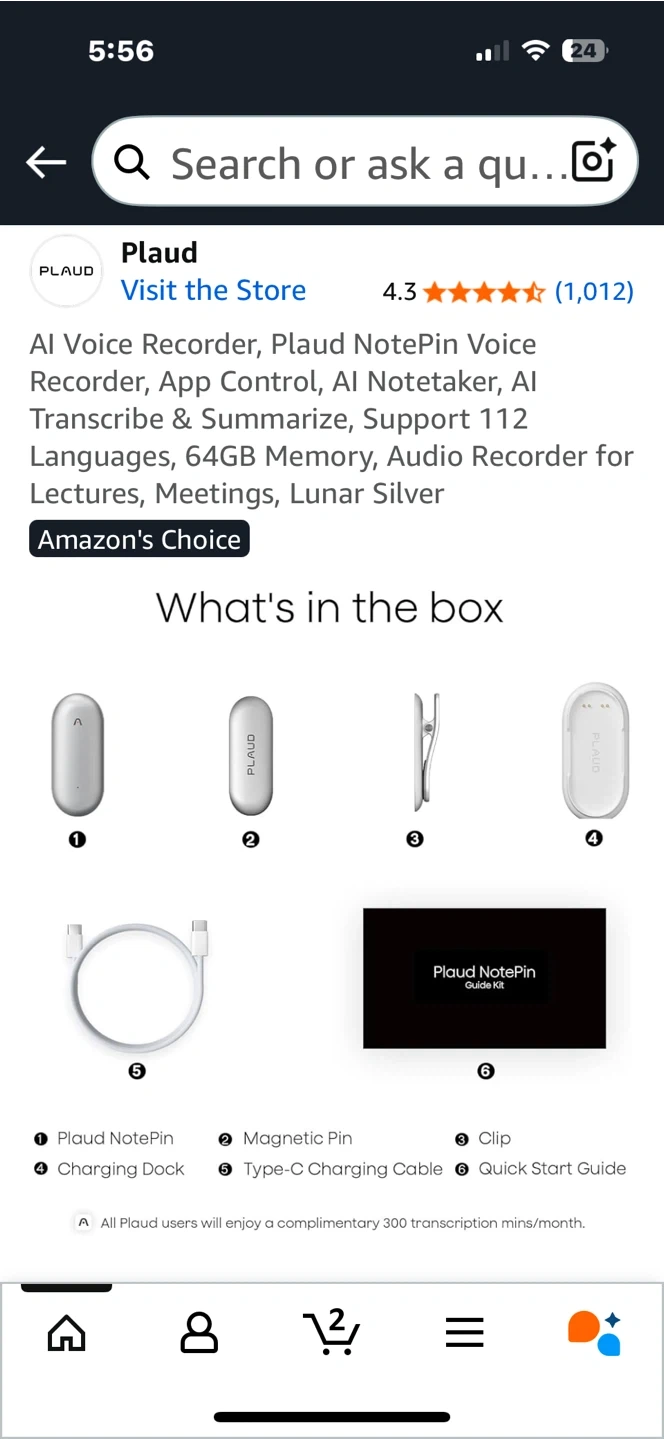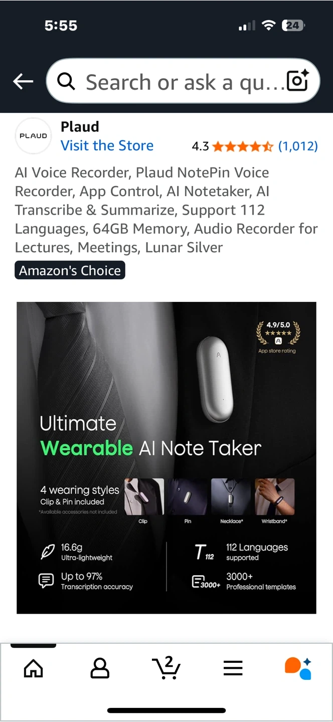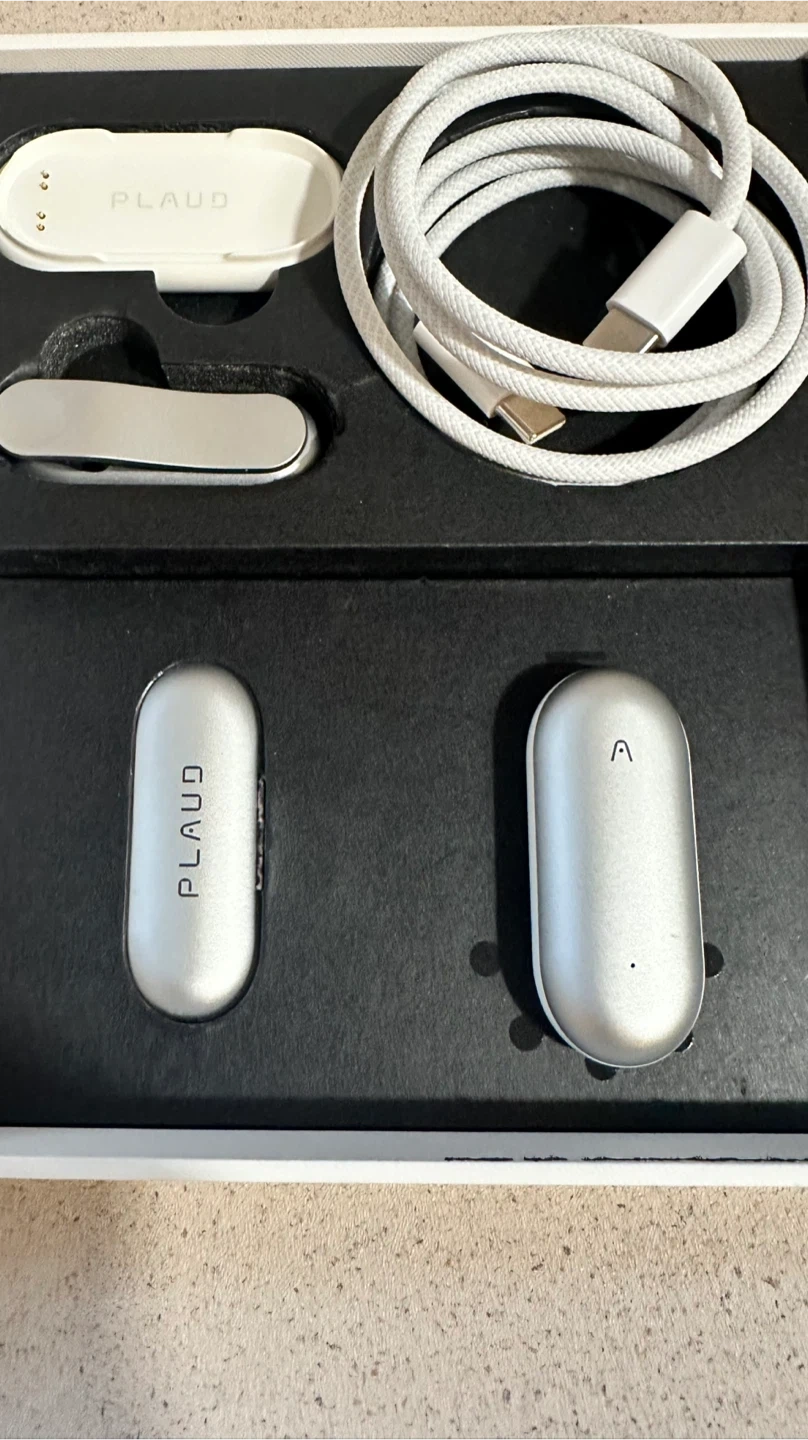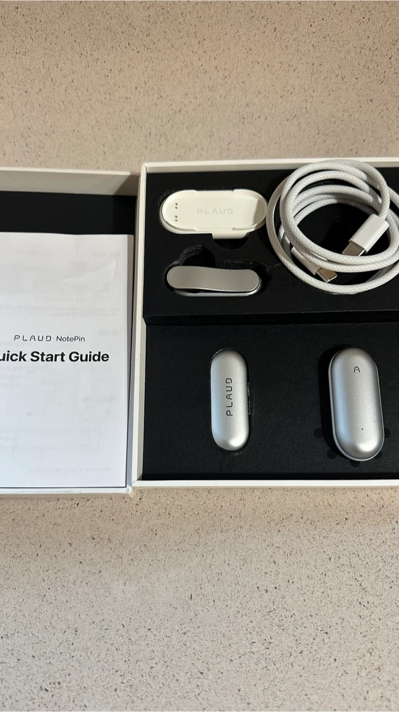 Selling a Plaud NotePin AI Voice Recorder in Lunar Silver! This nifty device can transcribe and summarize in 112 languages, with a 64GB memory. It's great for lectures and meetings. Comes with the box and all accessories, including the clip and pin for wearable styles. It's ultra-lightweight and has up to 97% transcription accuracy! New open box