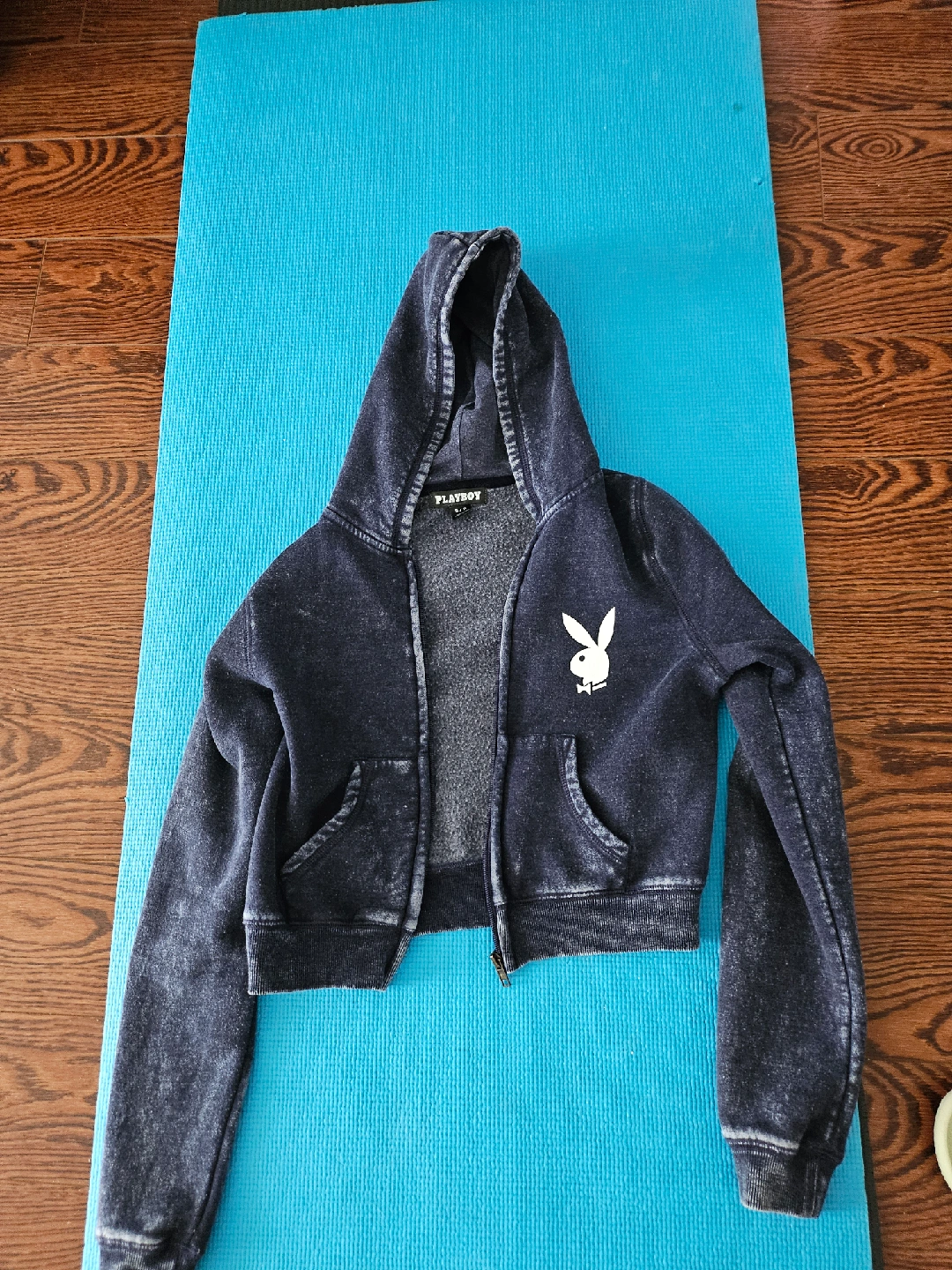 Selling a cute Playboy cropped zip up hoodie! It's a stylish blue colour with the classic Playboy bunny logo. Perfect for layering or wearing on its own!