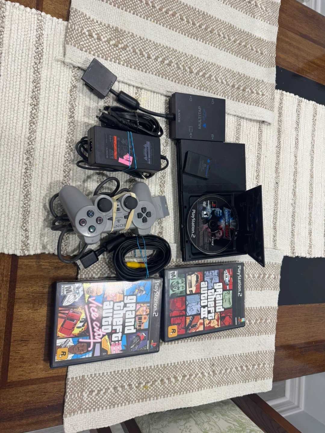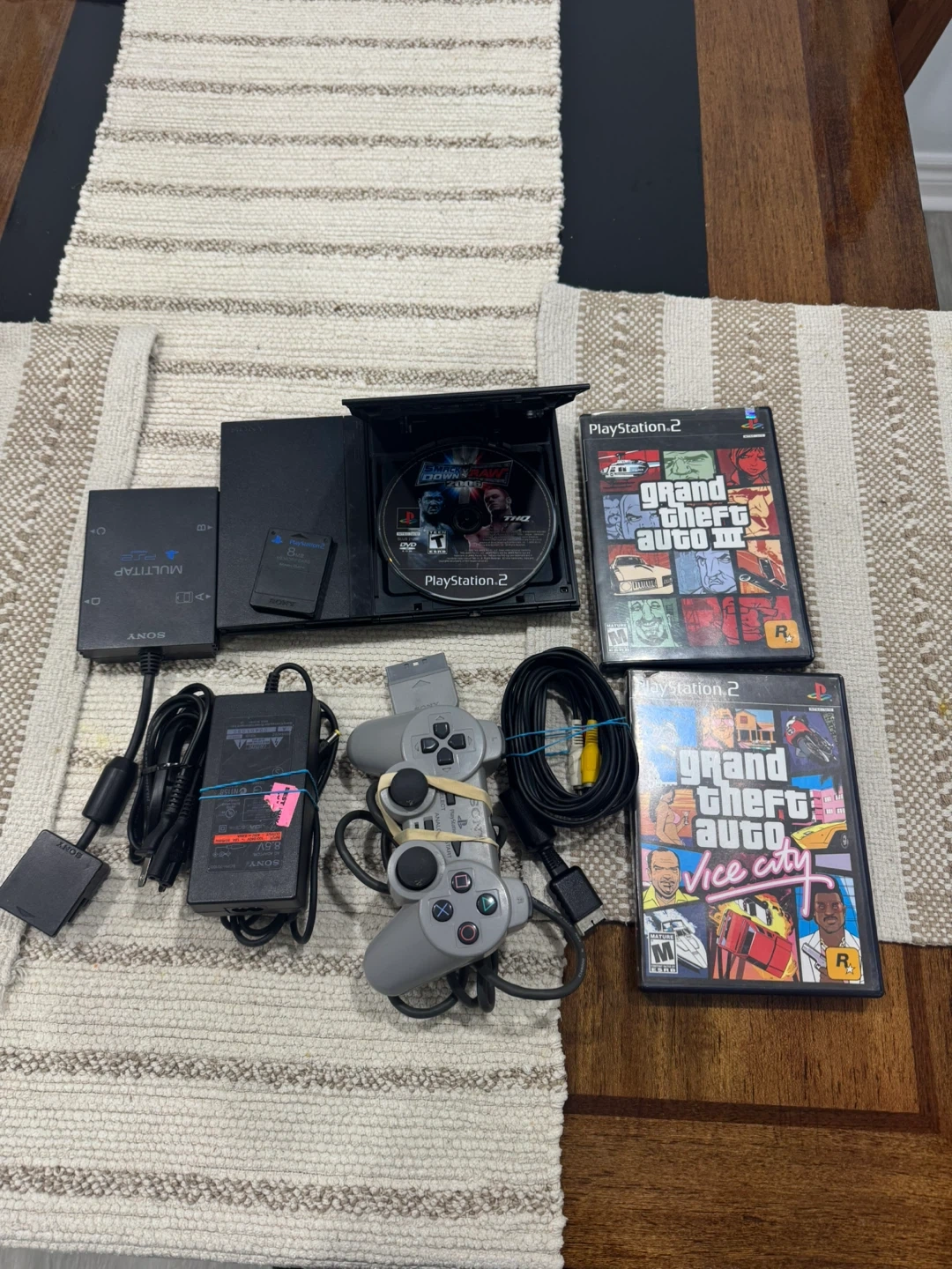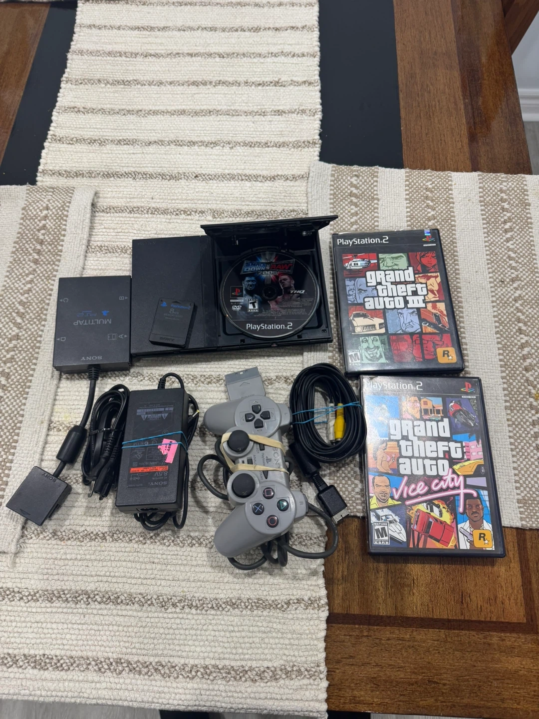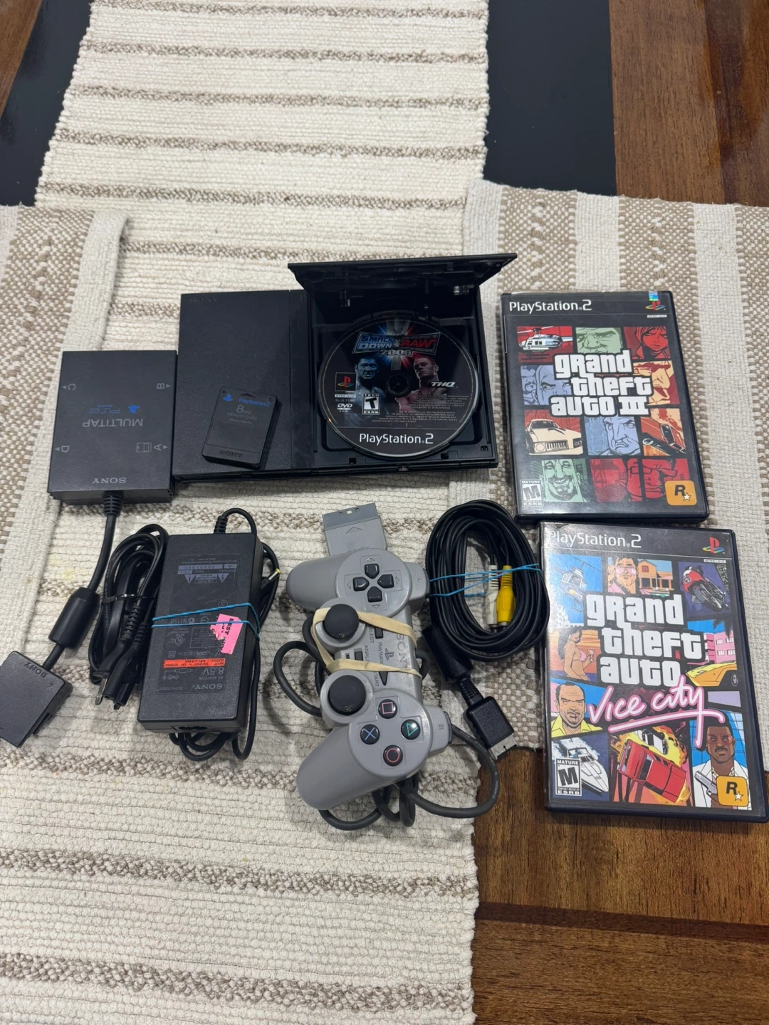 Selling a used PlayStation 2 Slim console that comes with one controller, a multitap adapter, and 4 games: Grand Theft Auto III and Grand Theft Auto: Vice City, WWE 2006 and Smackdown here comes the pain. This console is ready to bring back some retro gaming fun! It is in good condition and fully functional for hours of entertainment.