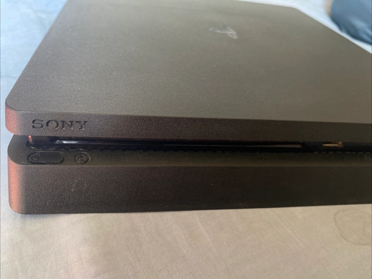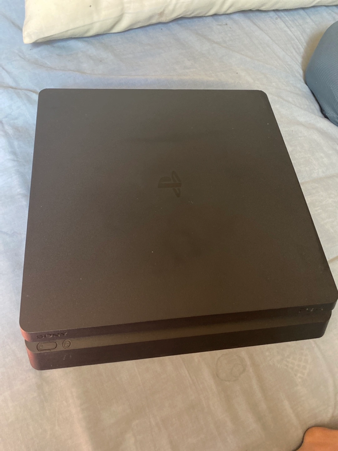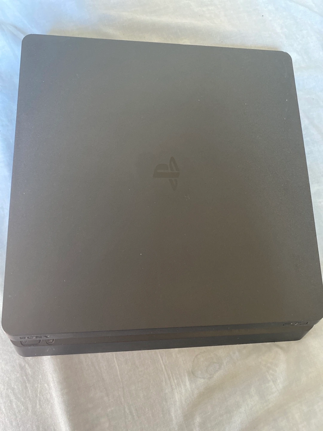 A black gaming console. The console has a matte finish. A logo is centered on the top. You can enjoy this item while unwinding at the end of a long day.