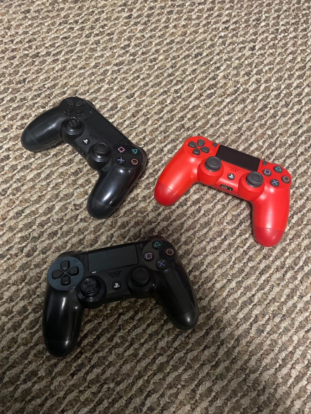 Selling a few used PlayStation 4 controllers. One is red, and two are black. They're in good working condition and ready for a new home! Red one is in great shape almost new. The black ones are broken down and missing the left stick, however they still work. That’s why the price is so cheap.