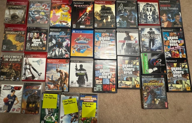 I'm selling the following games: * Resistance Fall of Man (SEALED)- $20 * Resistance 2 (SEALED) -$20 * Naruto Shippuden Ultimate Ninja Storm 2 (SEALED)- $20 * Grand Theft Auto IV & Episodes from Liberty City- $25 * Mobile Suit Gundam SEED: Never Ending Tomorrow- $40 * All GTA PS2 Games- $10 * Shadow of the Colossus-$10 * Resident Evil Code: Veronica X- $15 * Resident Evil 4- $20 * Swashbucklers: Blue vs Grey- $15 * God of War- $10 * The SpongeBob SquarePants Movie- $10 * Resident Evil Outbreak- $40 * Gran Turismo 2- $10 * Skylanders Superchargers- $30 * All other games are $5. If you have any questions about a specific game or would like more photos, please let me know. COD World at War is sold.