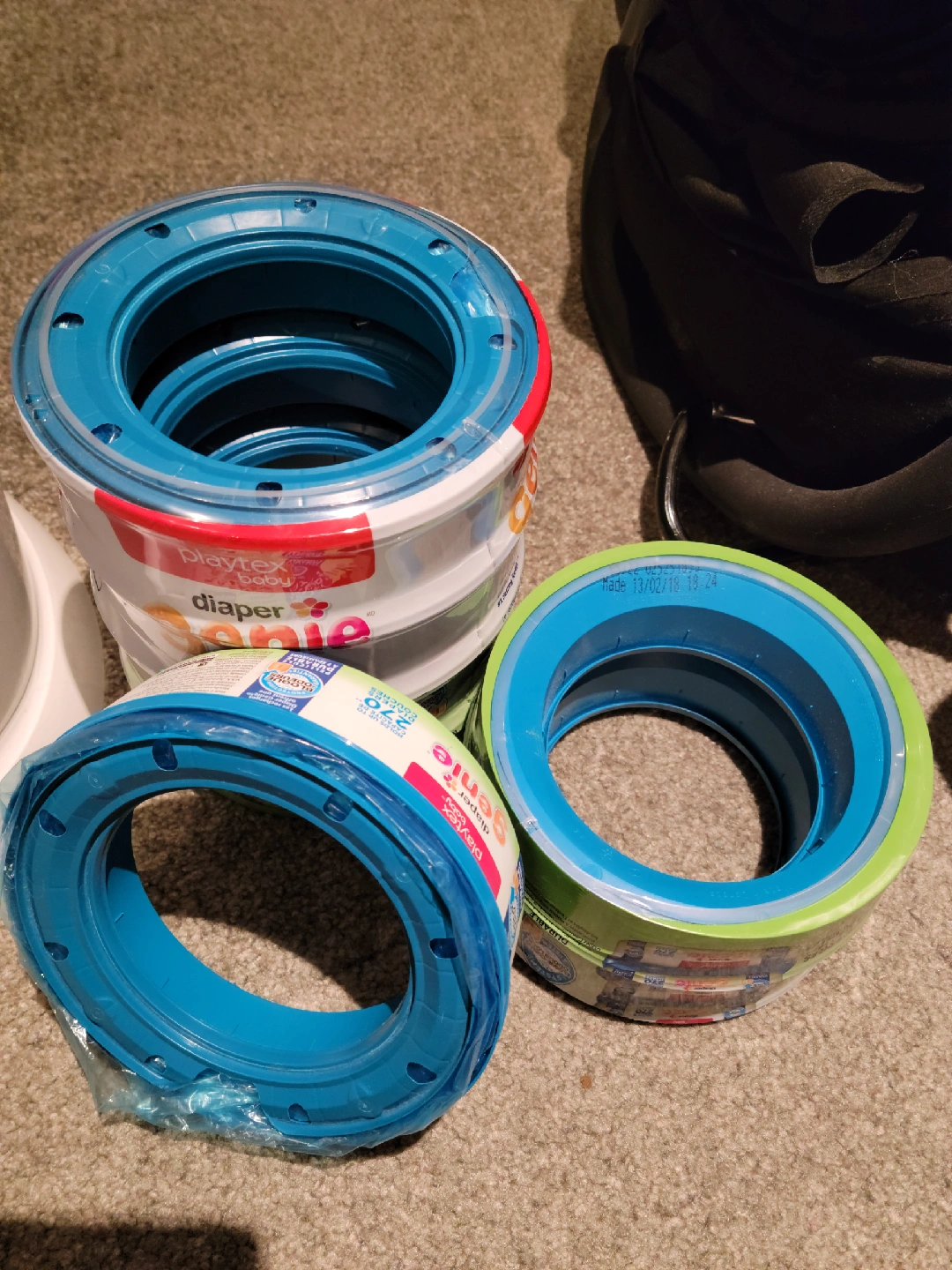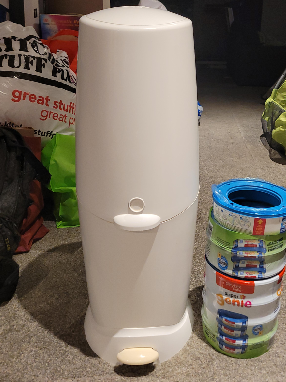 Playtex Diaper Genie refills (6x brand new + one opened) will come with the pail in fair condition. The lit is a but broken but still usable. Great for keeping odours at bay!