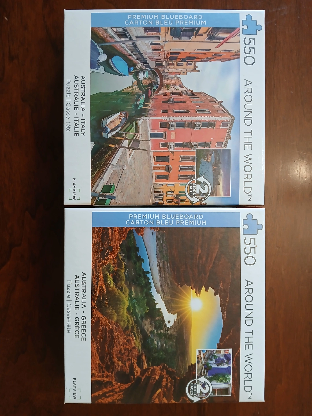 Selling a set of Playview double sided 550 piece puzzles from the "Around the World" series! Each puzzle features a beautiful scene from either Australia, Greece, or Italy. They are premium blueboard carton bleu puzzles, perfect for a relaxing afternoon activity. Price is for the pair