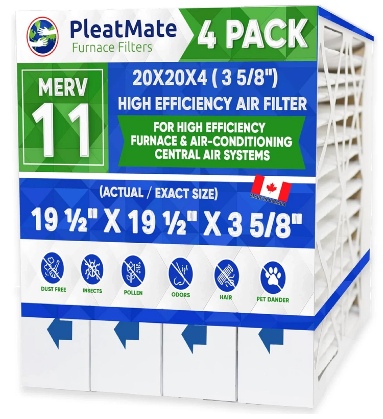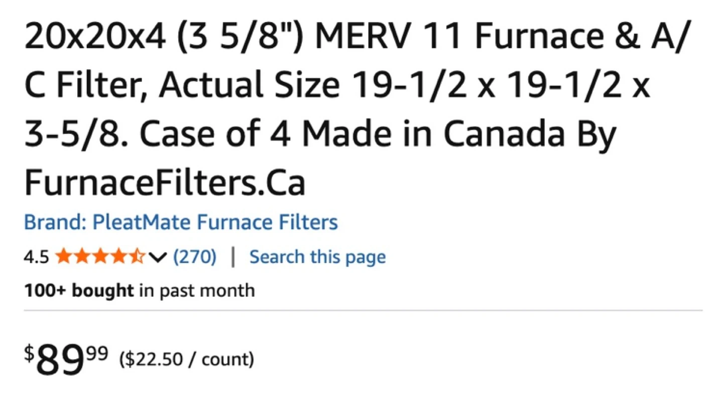 Selling a 4-pack of PleatMate furnace filters. They are MERV 11 and designed for high-efficiency furnace and air-conditioning systems. The actual size is 19 1/2" x 19 1/2" x 3 5/8". Originally bought for $89.99 Perfect for a DIY Box Fan Filter