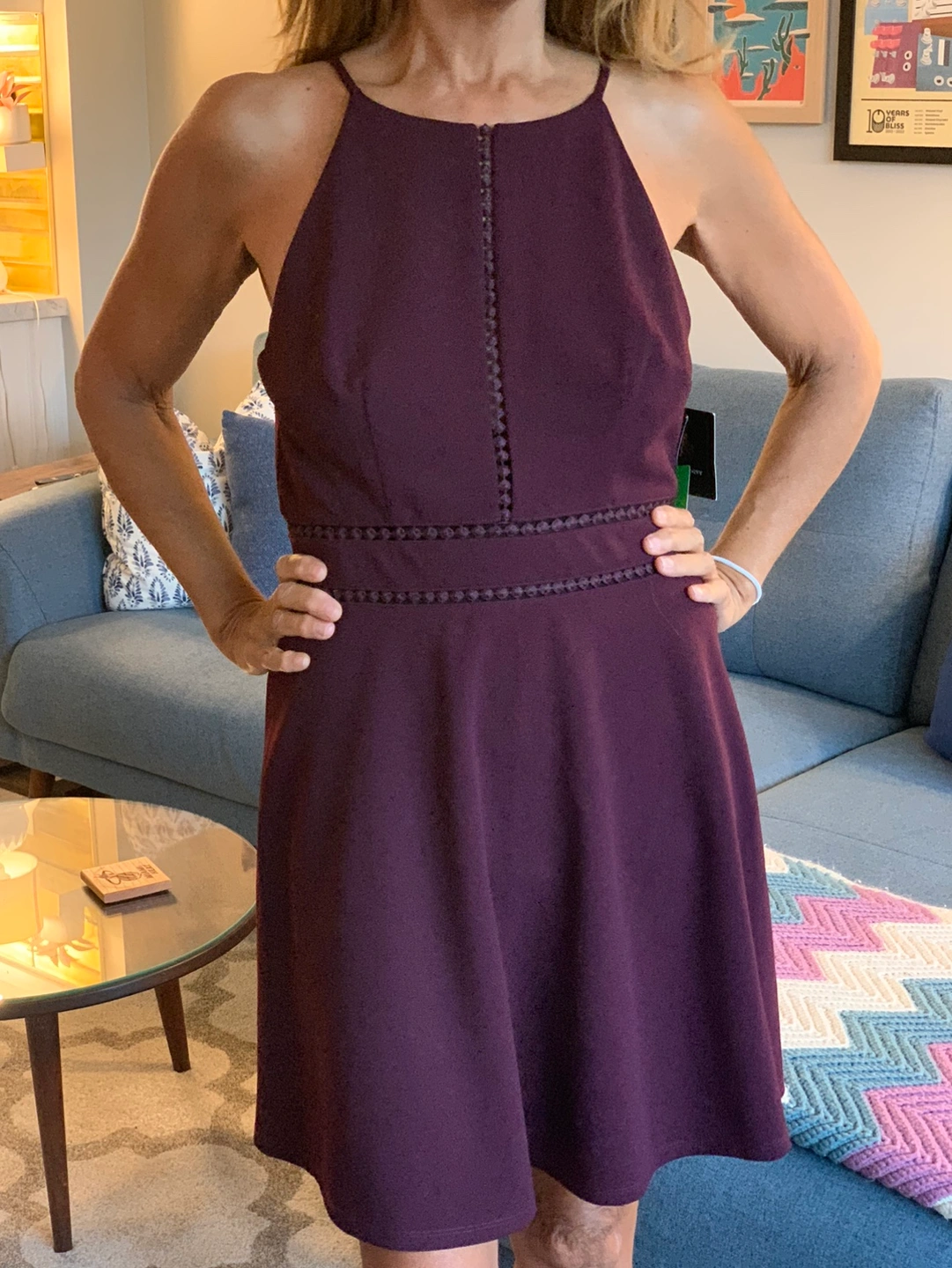 A sleeveless spaghetti strap dress with a back zipper closure and keyhole detail. The dress is a darker shade of purple and has a fit and flair cut. There is a cutout detail around the bodice and along the waist. Has darts on front. Still has tags. No flaws to note. Bodice is lined. Tag reads size 8. 94% Polyester, 6% Spandex. Lining - 100% Polyester See photos for measurements, feel free to ask me about sizing questions and for more measurements. Happy to help! Compare measurements to a similar item you own. Model is a size SMALL 5-7 Model is 5’7 in height Smoke and pet free home ⭐️Hello, my name is Jasmine. I recently moved to Toronto from the U.S. where I used to sell vintage and secondhand clothing. I brought my remaining stock with me, and items are priced to move. I am friendly and always happy to answer any questions - so feel free to message me! I live near the intersection of Bathurst and Eglinton. I prefer pickup, but will consider delivery if I’m in the area or at an extra cost. Open to offers!’⭐️